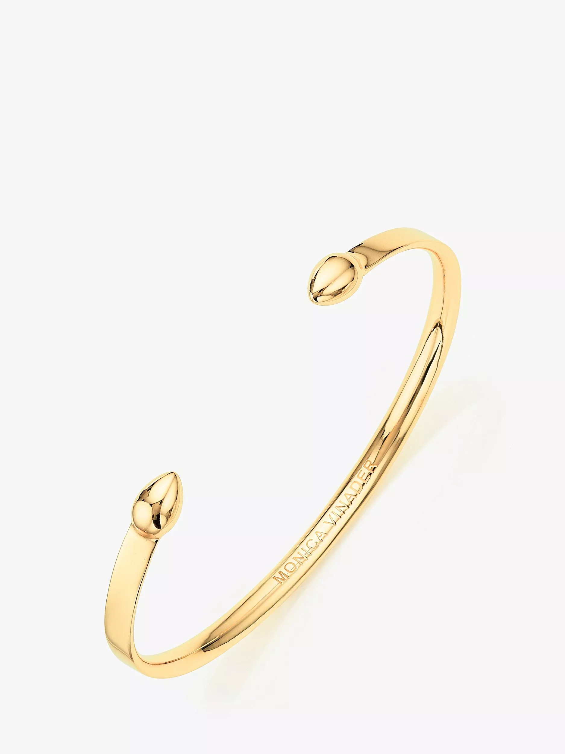 Inspired by natural floral buds, this Monica Vinader cuff offers a sleek open design that ends with two small polished buds. The cuff can be worn on its own or with other bangles or chain bracelets for more impact.