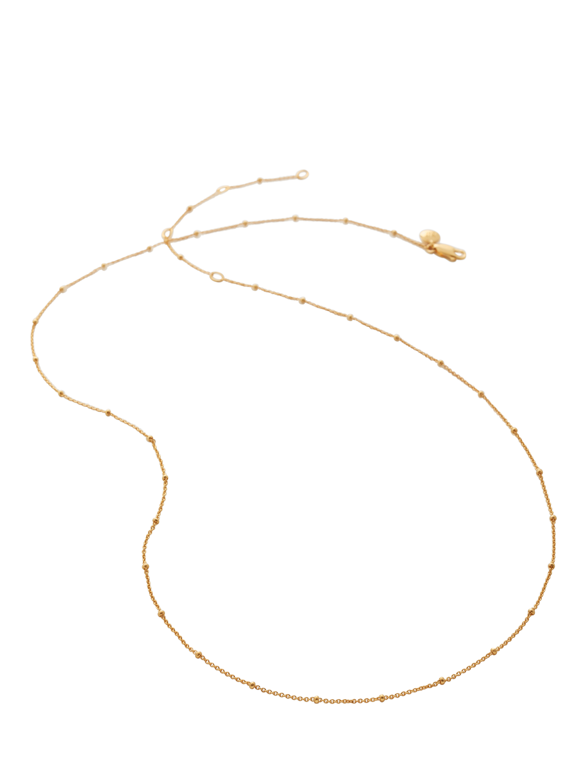 This delicate Monica Vinader fine beaded chain is made from sterling silver and covered in a choice of gold platings. The design lends itself to versatility as it is perfect for holding your favourite pendant charms, or wearing alone for a chic look. The chain features three jump rings, allowing you to adjust the length. Every hand-crafted Monica Vinader piece comes with a 5-year warranty and lifetime repairs.