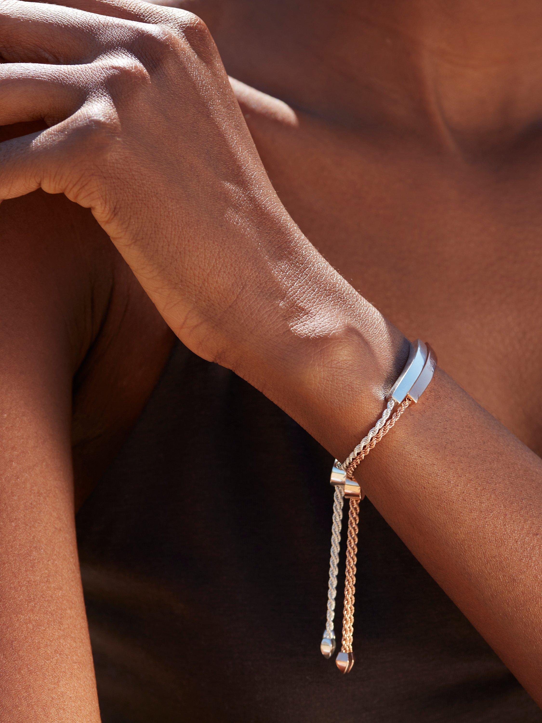 This sleek bracelet from Monica Vinader features a streamlined, curved bar offset by twisted rope chains. The bracelet presents a toggle that slides to easily adjust the chain's length for a snug fit. You can wear yours with other Linear bracelets to create your own unique look. Every hand-crafted Monica Vinader piece comes with a 5-year warranty and lifetime repairs.