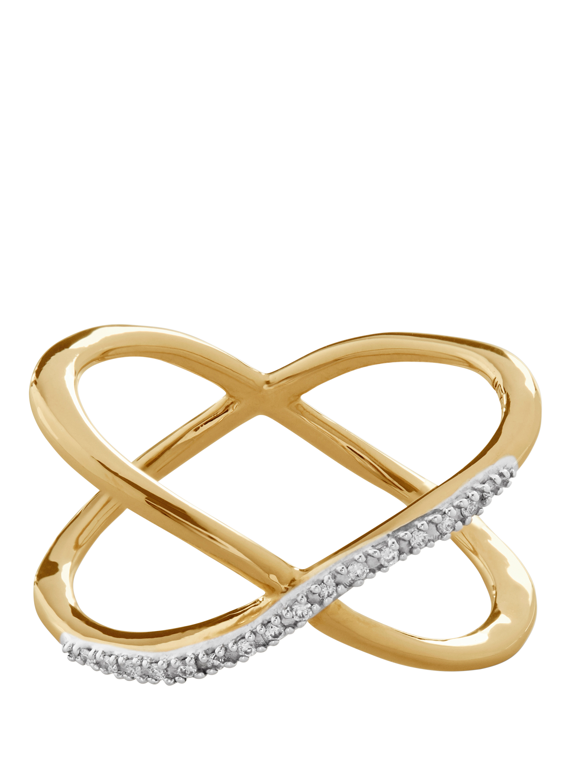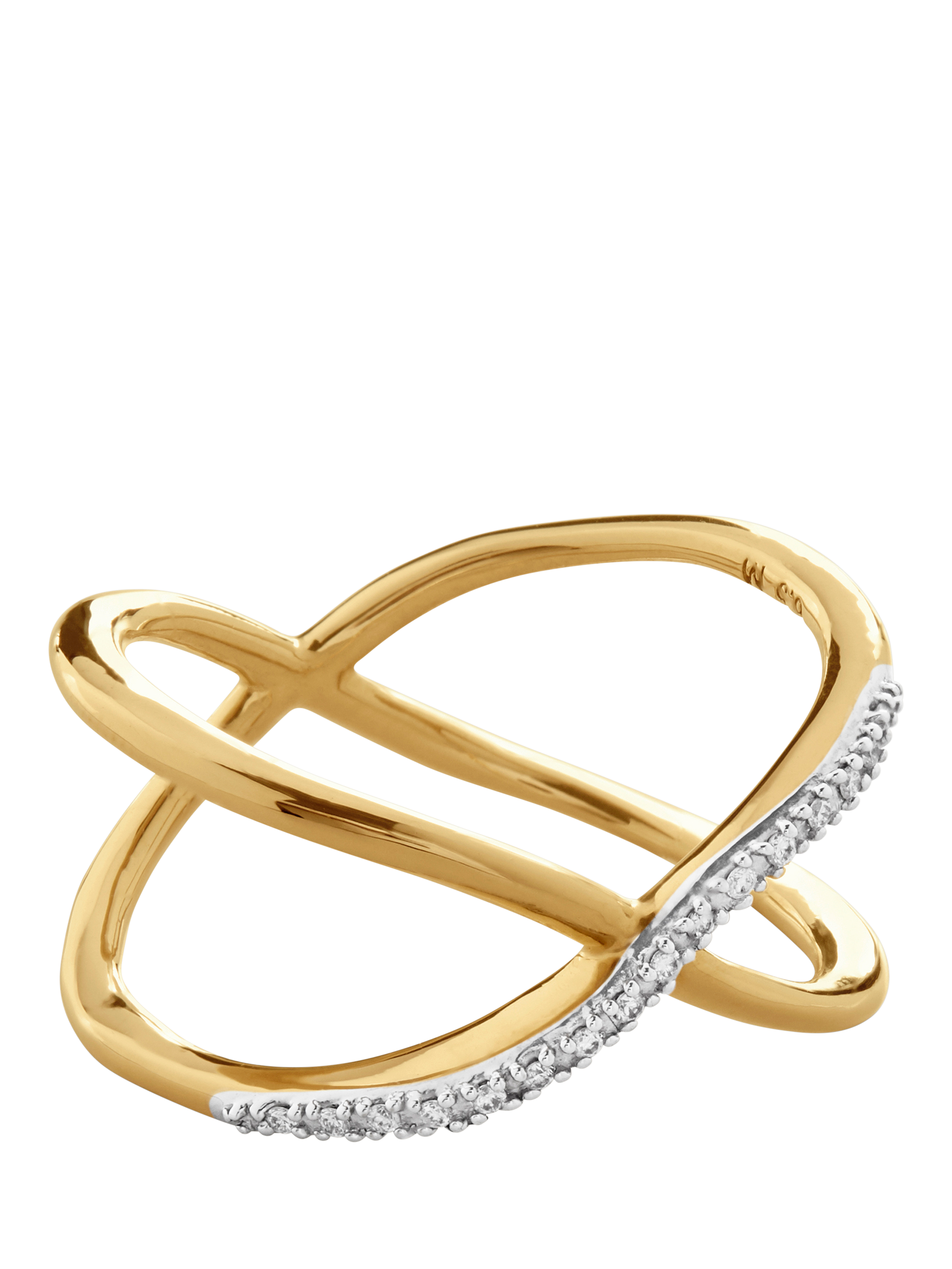 Two bands of gold vermeil and pavé diamonds cross over the finger to meet in a gentle 'kiss'. Sparkling pavé diamonds are handset in a delicate crossover 'x' for the most elegant kiss ever. Wear alone for a touch of romantic glamour, or pair with other Riva diamonds for hands-down drama. UK size M.