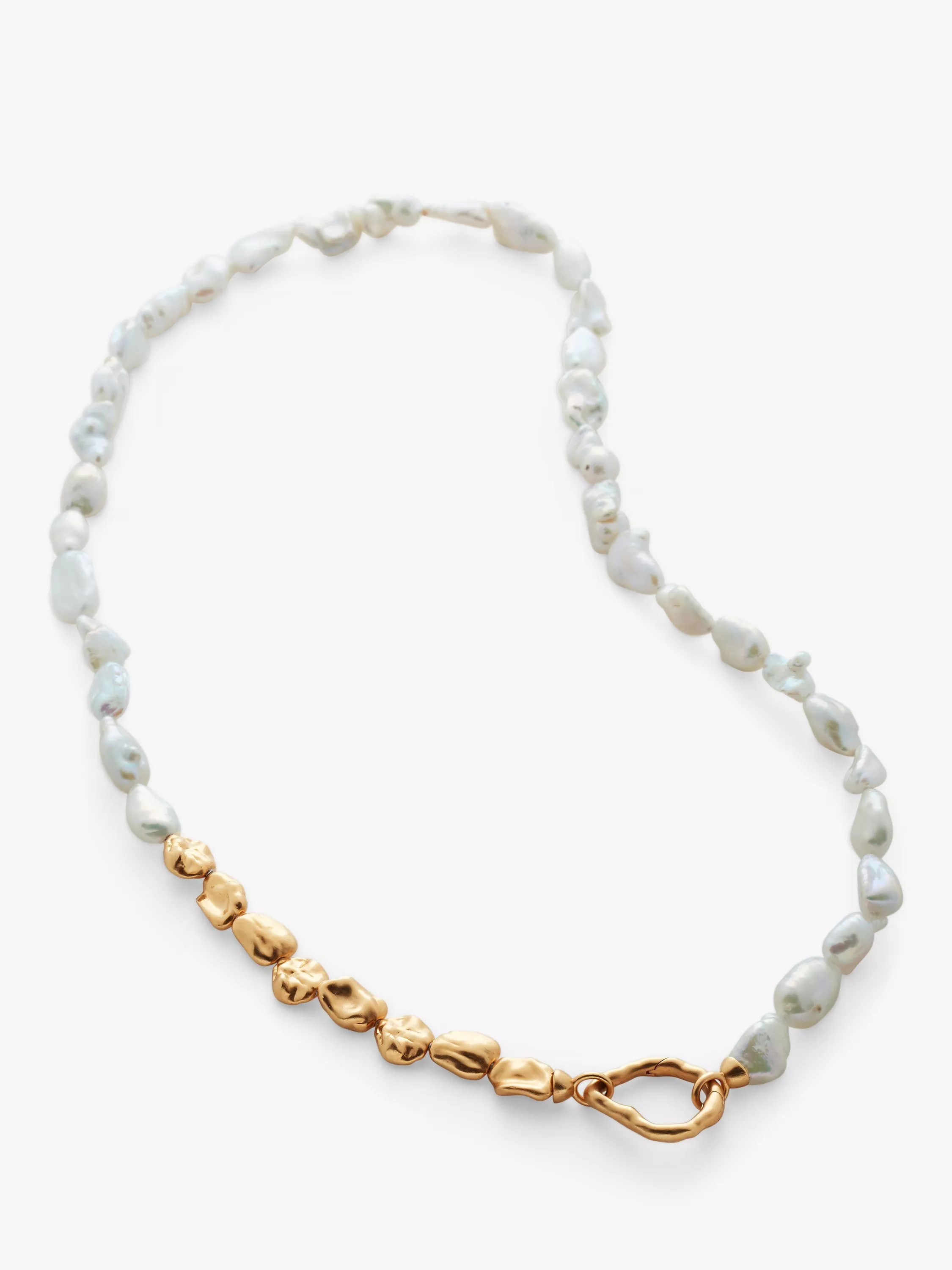 In a modern mix of pearl and molten beads, this necklace is a modern take on traditional pearls. The necklace looks great on its own but can also be used as a part of a layered style.
