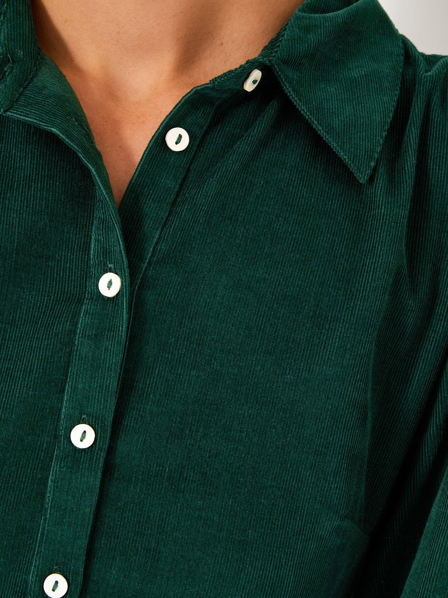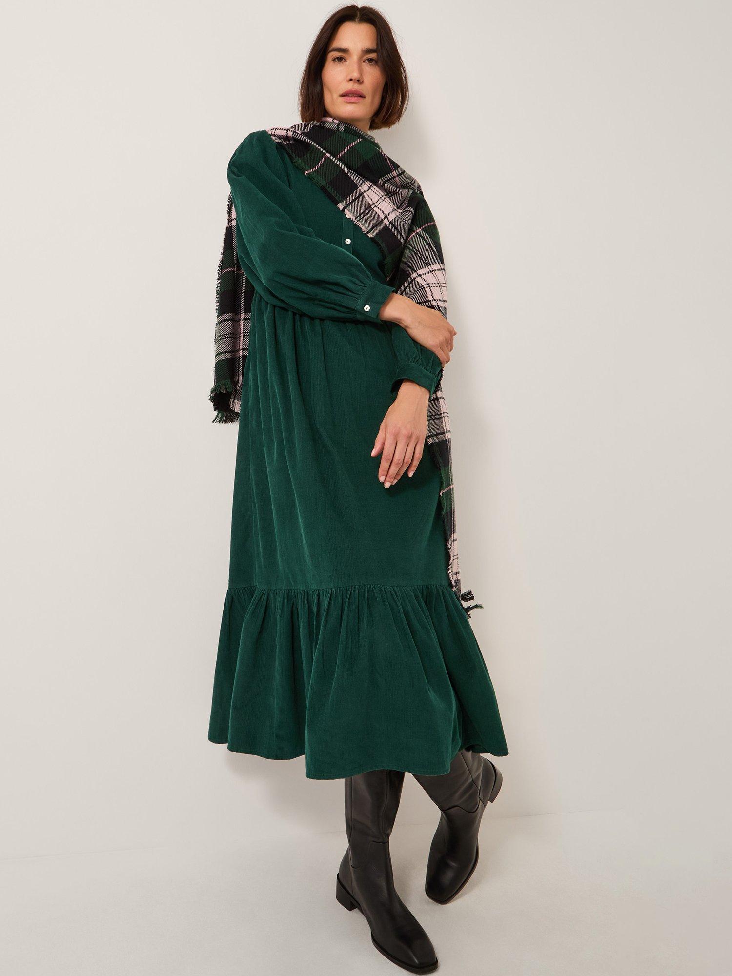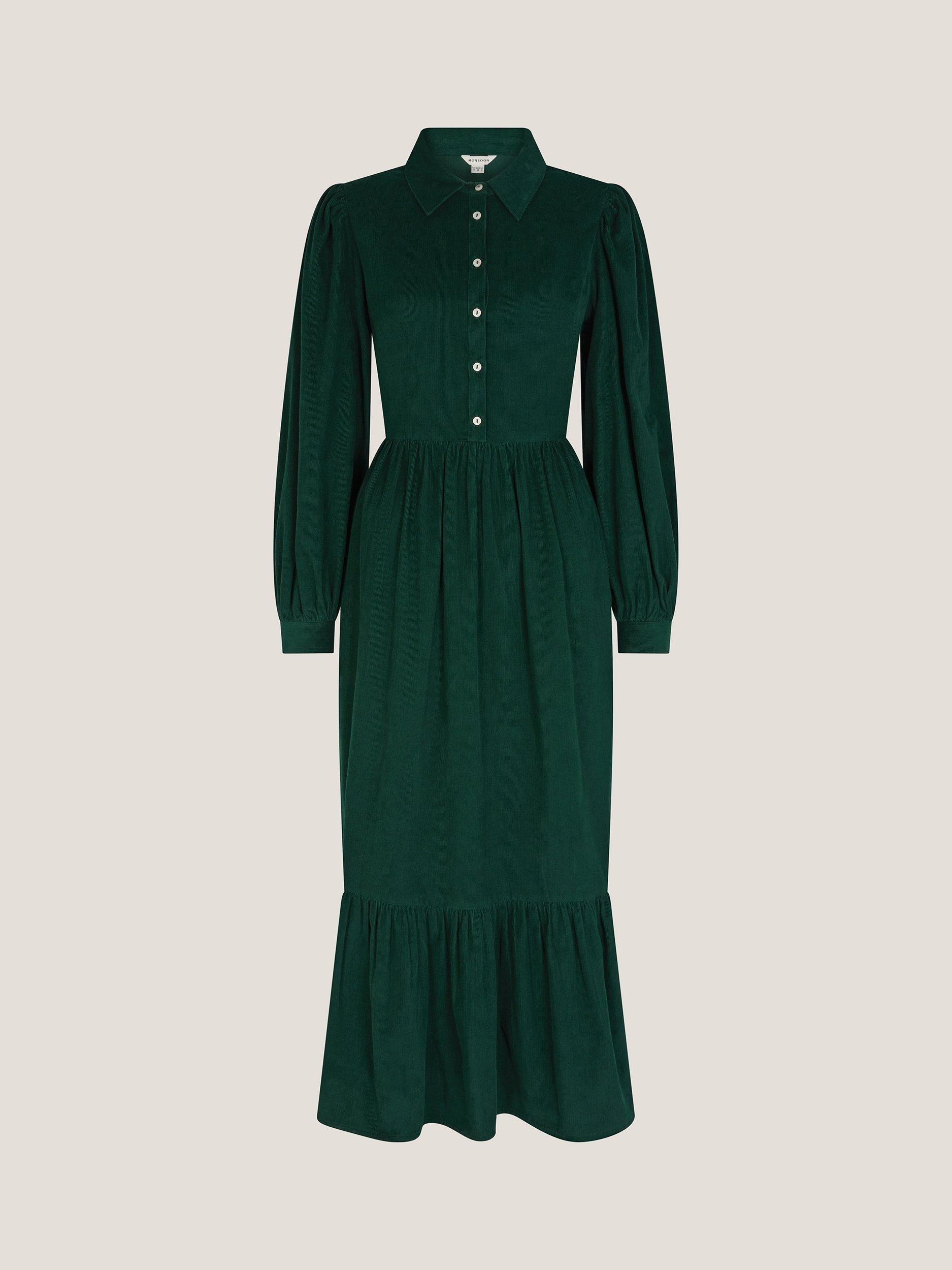 Designed in soft corduroy this shirt dress features long, blouson sleeves, a front button placket and a statement frill at the midi-length hem.