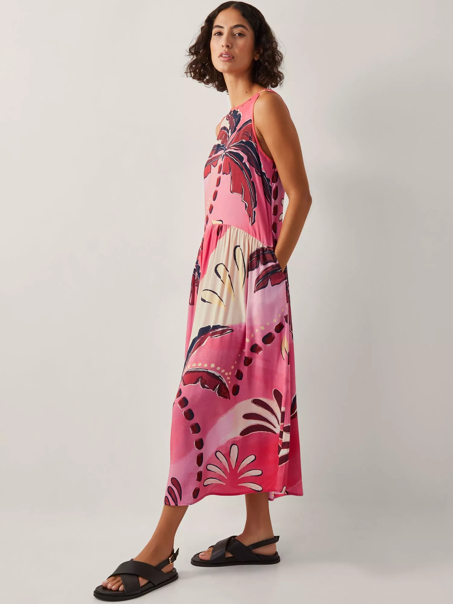 Splashed in summery hues with an artful palm print for a tropical touch, this dress is built with a relaxed fit that'll leave you chilling all summer long. Featuring a sleeveless bodice, drop waist, and midi-length skirt, it's finished with pockets to take that laid-back energy to the next level.