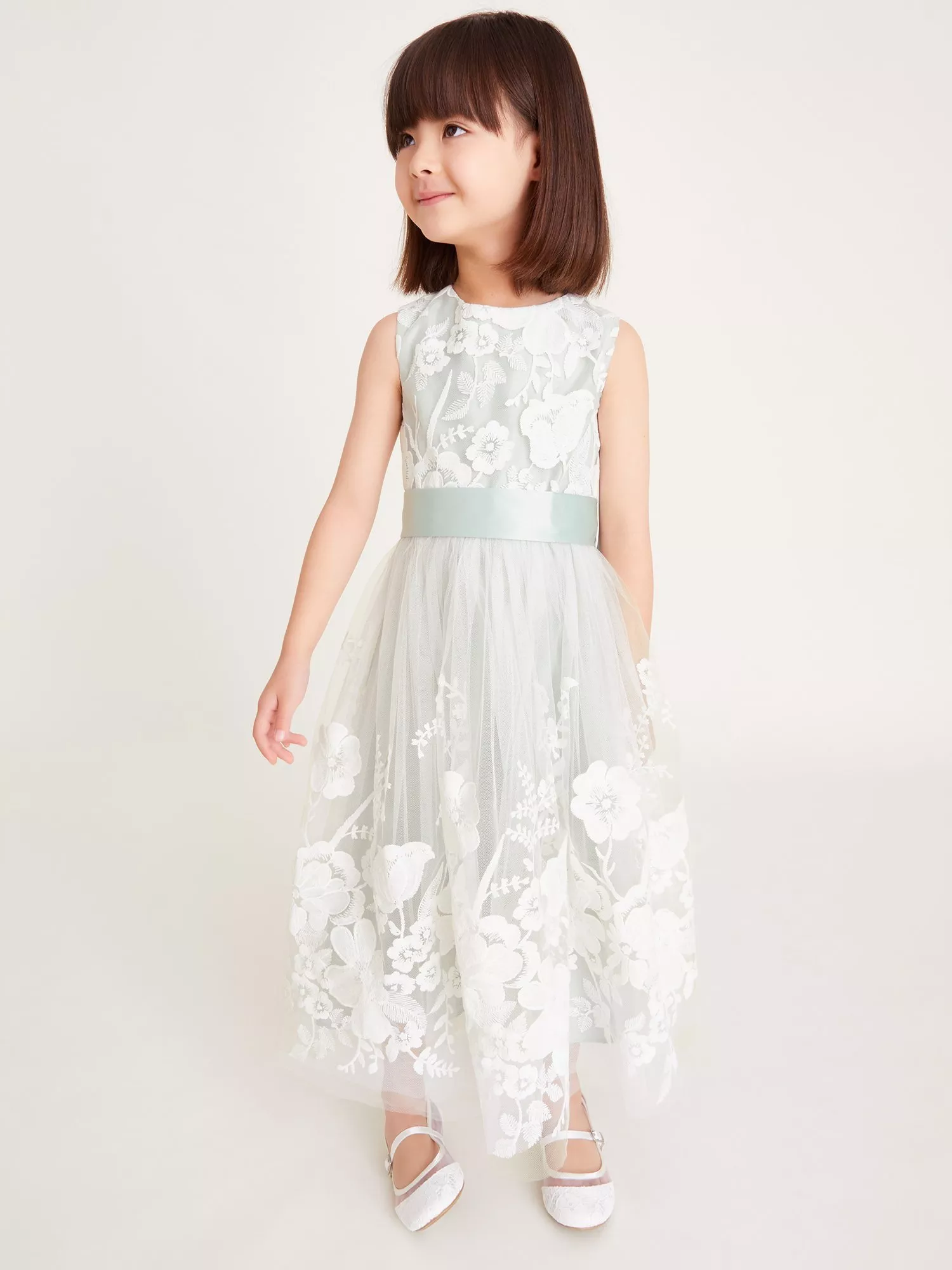 For the little ones who love to dress up, this regal style features sage tulle topped with floral embroidery. Cut in a sleeveless silhouette, it's fully-lined for comfort.