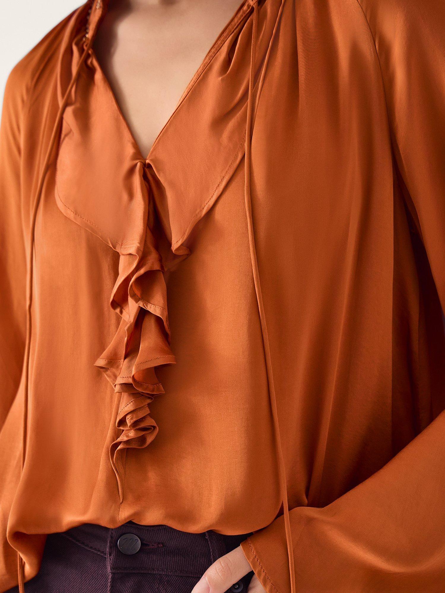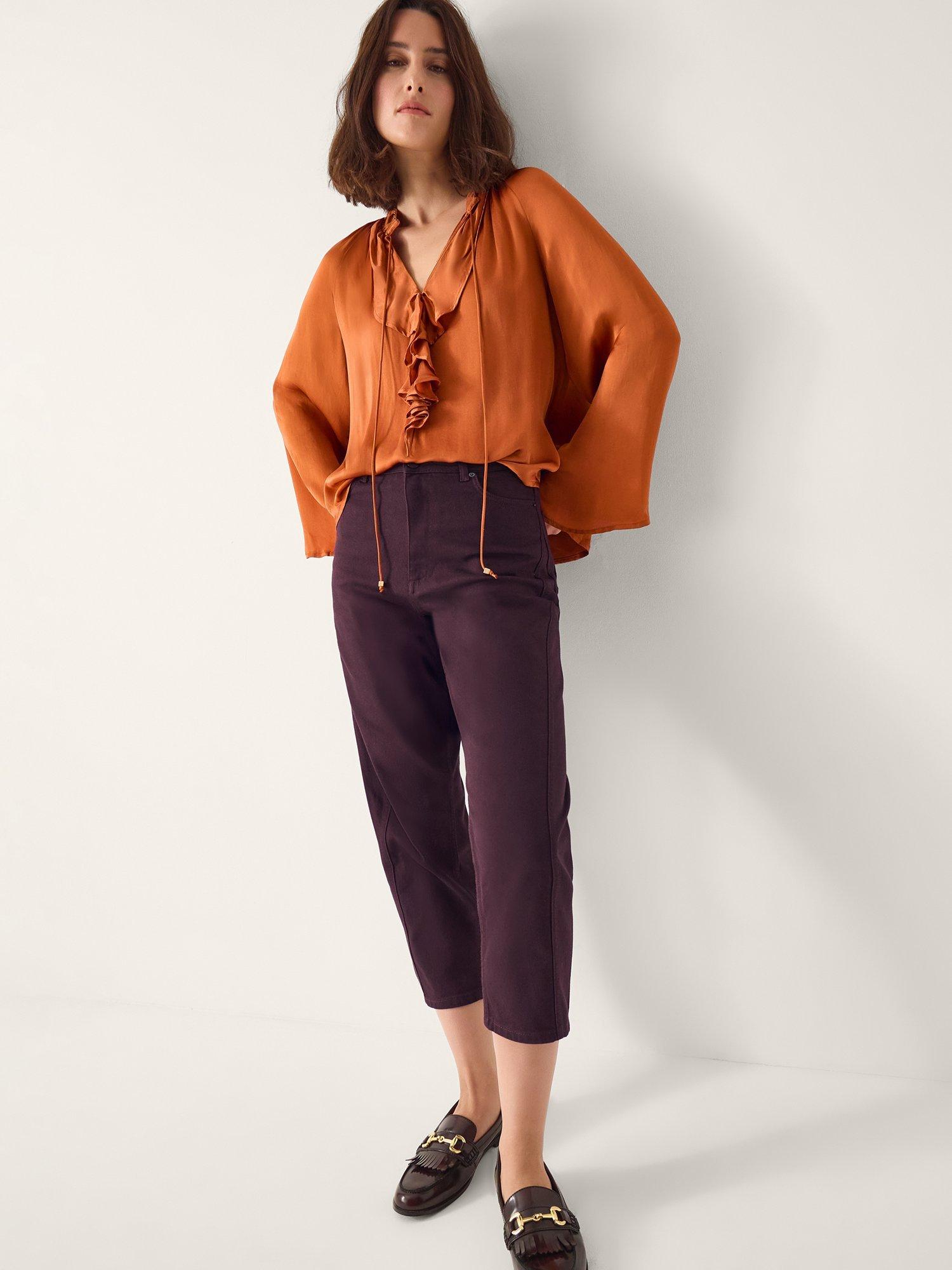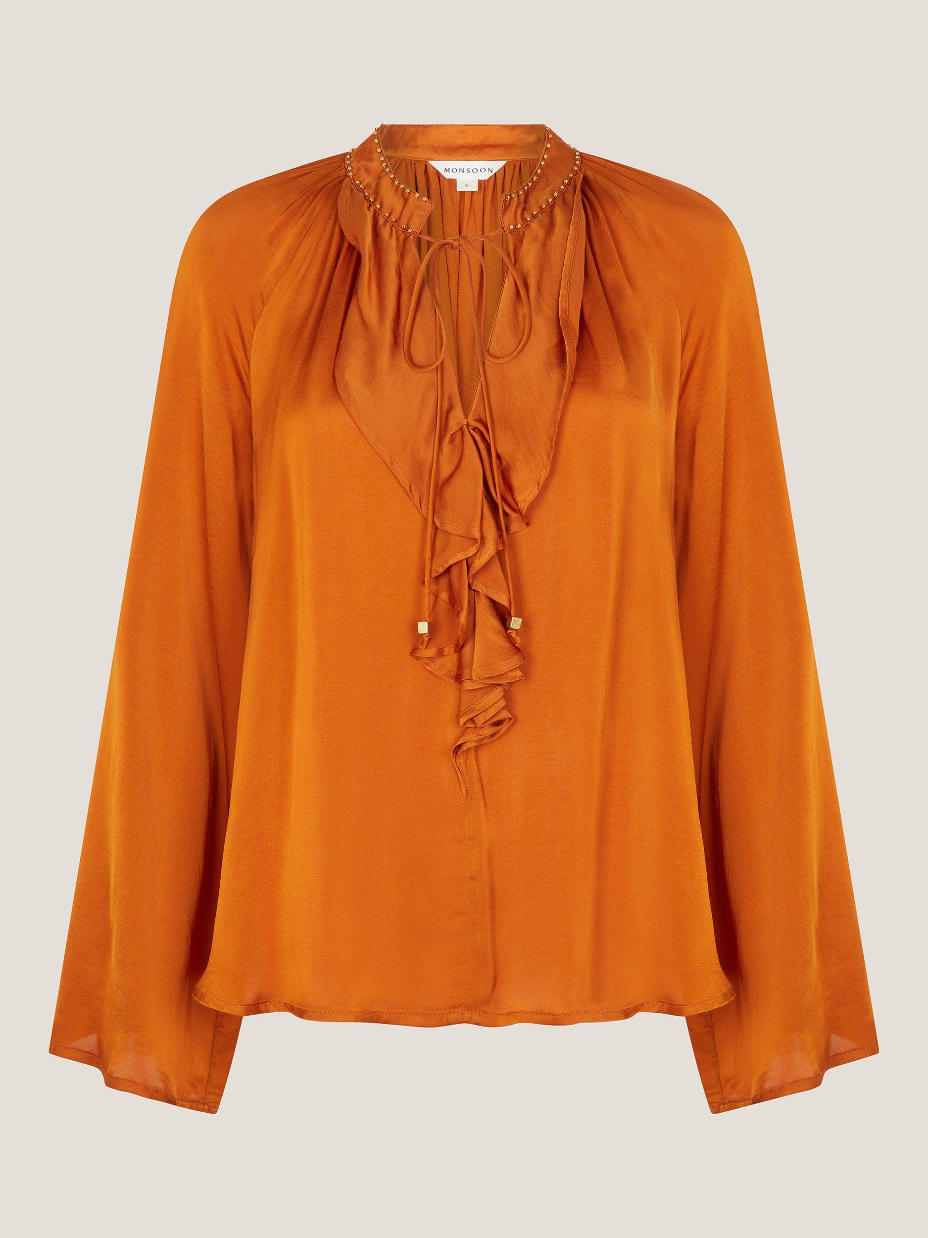 A textured frilly blouse from Monsoon, made from light viscose. With a V-neck and long sleeves, it comes in an easily styled plain colouring. One you'll reach for again and again.
