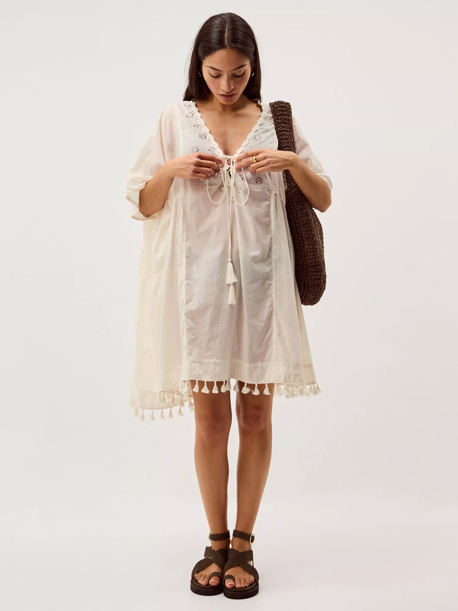 Like air con you can wear. Being best dressed, even at the pool, is within reach whilst flaunting this mini kaftan. Designed with applique flowers and sequin embellishments around the V-neckline, it features an extra-long tassel tie and relaxed sleeves, so you comfortably lie on the sun lounger. Finished with mini tassels along the short hem, all your friends will want a try, too.