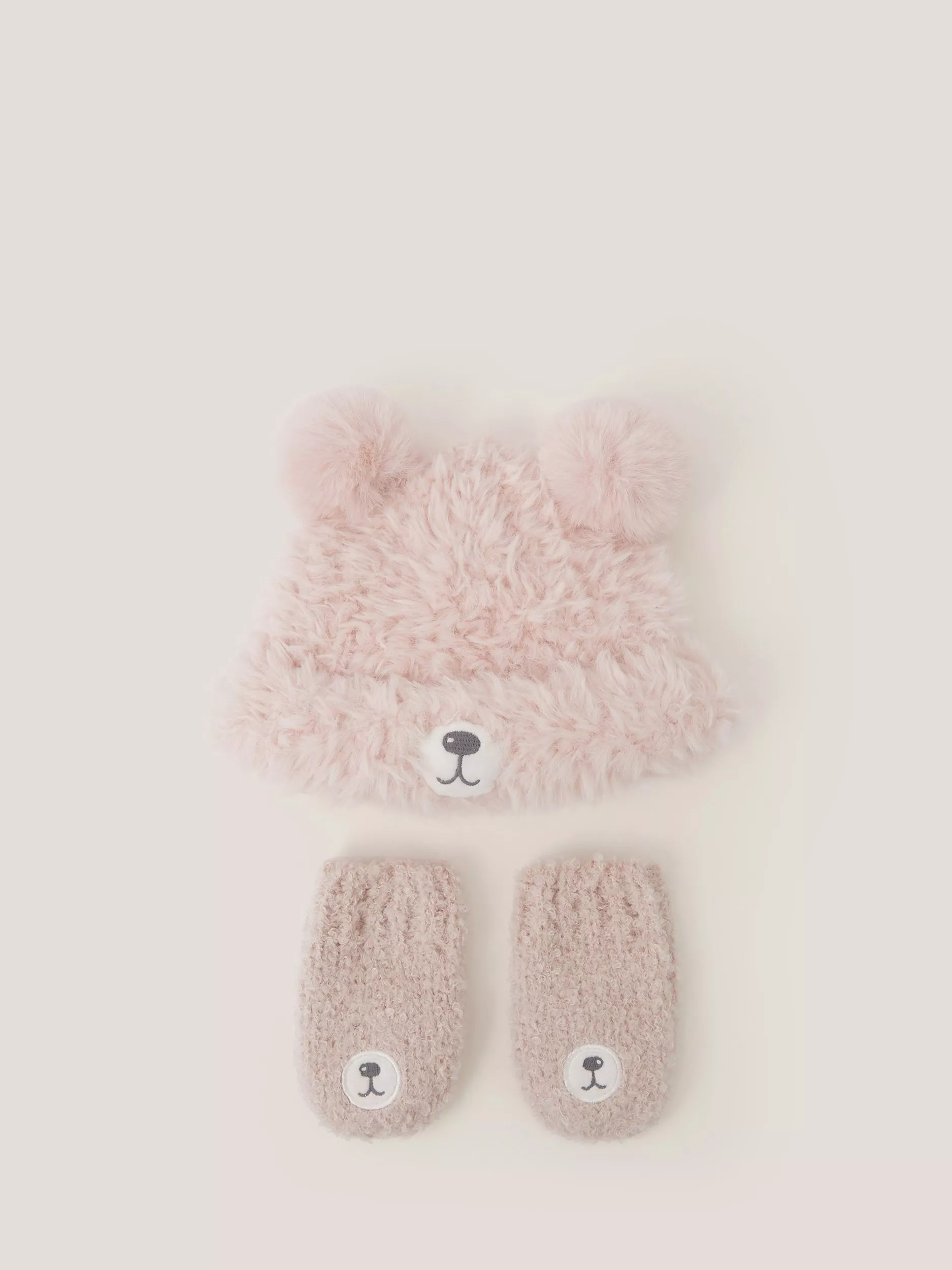 This set includes a fluffy beanie hat and matching mittens with a cute bear design.