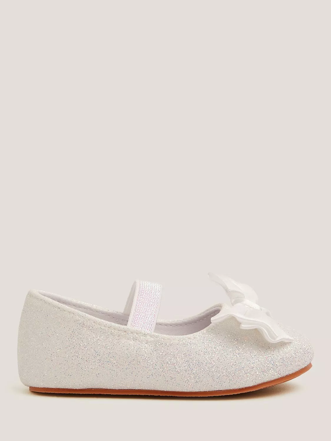 Perfect for special occasions and parties, these walkers are sprinkled with glitter and topped with a ribbon bow. Finished with a stretchy top strap for keeping their wriggly toes in place.