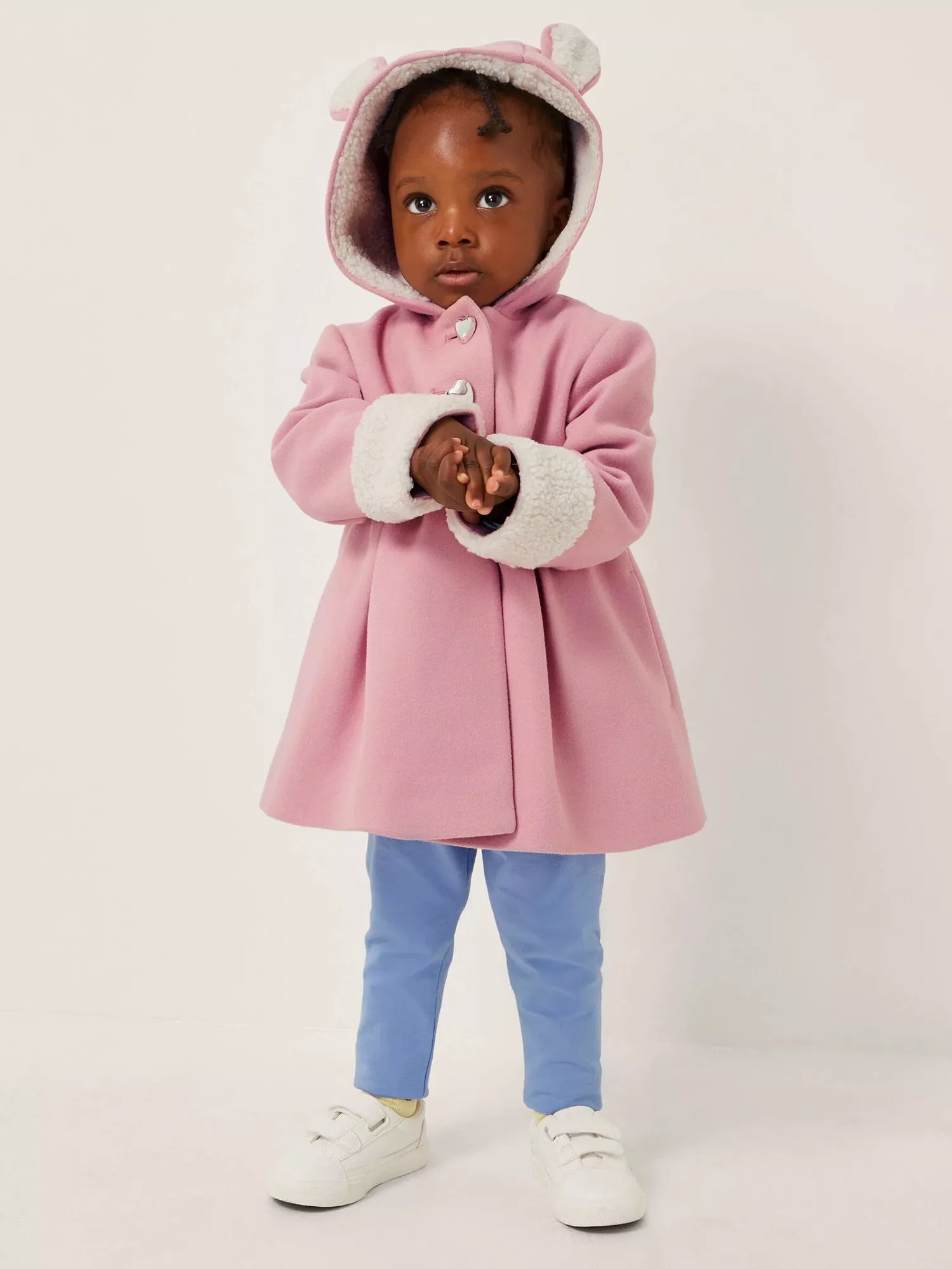 Designed in baby pink, this cute coat features faux shearling cuffs and cute bunny ears on the hood. Finished with silver-tone heart button fastenings.