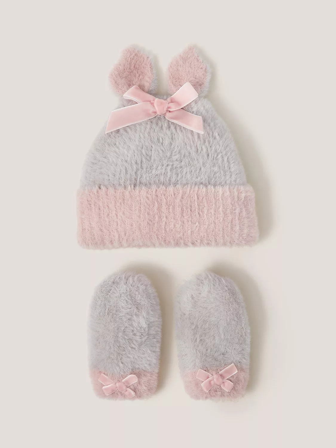 Stitched with super-soft fuzzy yarns in pink and grey, this snuggly set is perfect for baby to burrow their head and hands into all winter long. The set includes a rabbit ear-topped beanie hat and matching mittens, both finished with velvety pink ribbon bows.