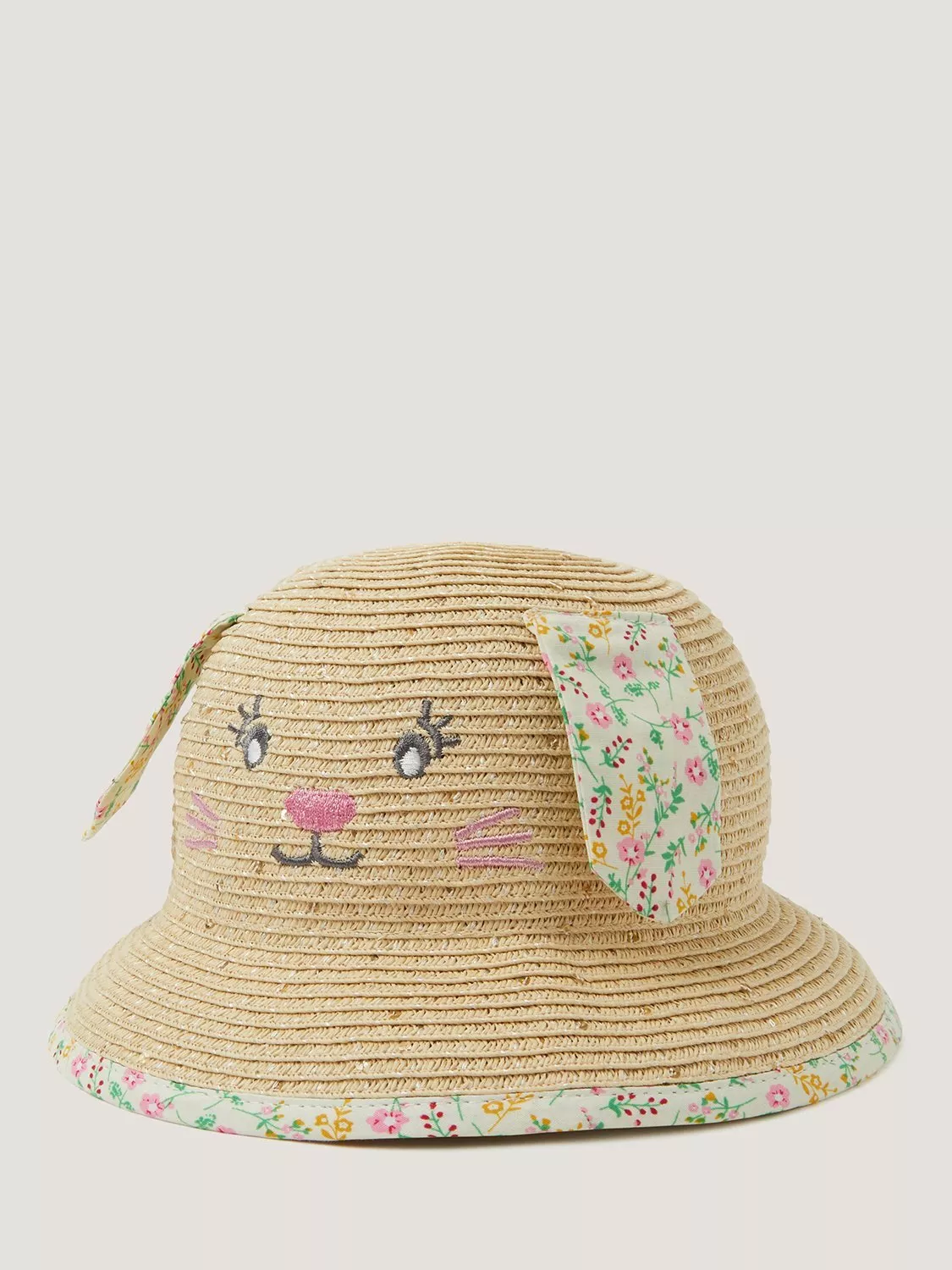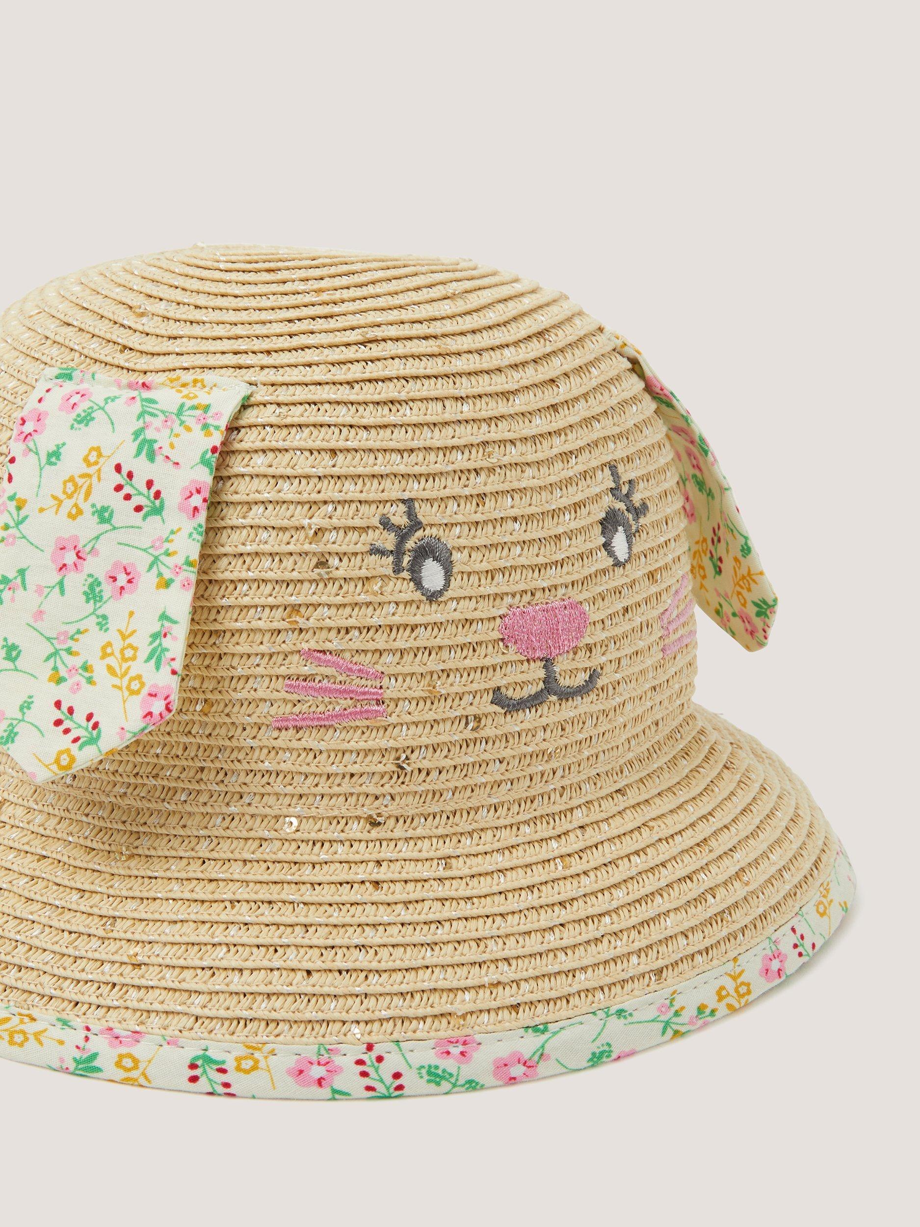 A cute accessory to let baby wear whenever the sun is shining. This sun hat is woven in straw with floral floppy ears and a sweet bunny face stitched on the front.