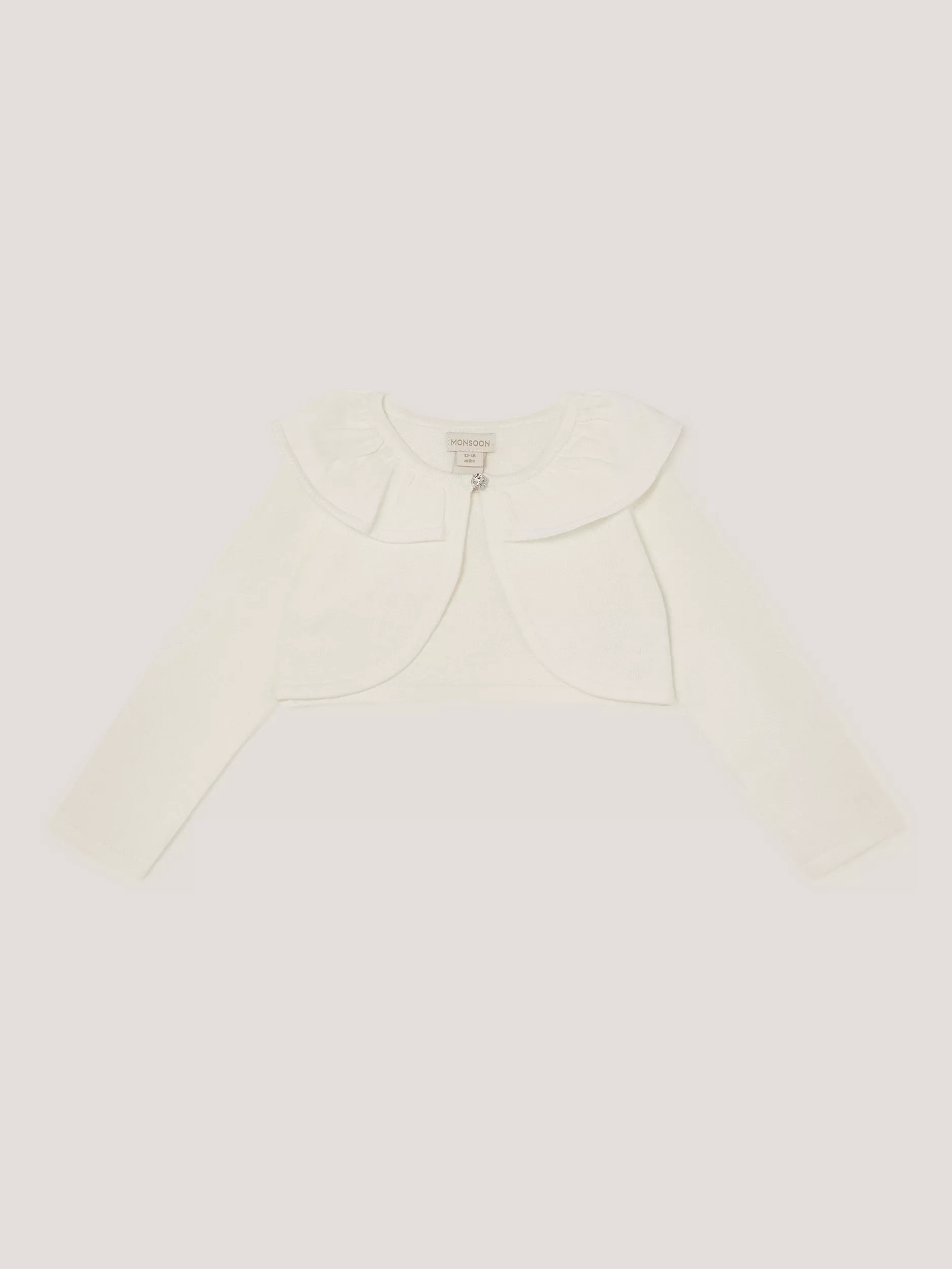 The perfect layer to go over all their party outfits, this cropped cardigan is designed with an oversized ruffle collar and a dainty diamante button to finish.