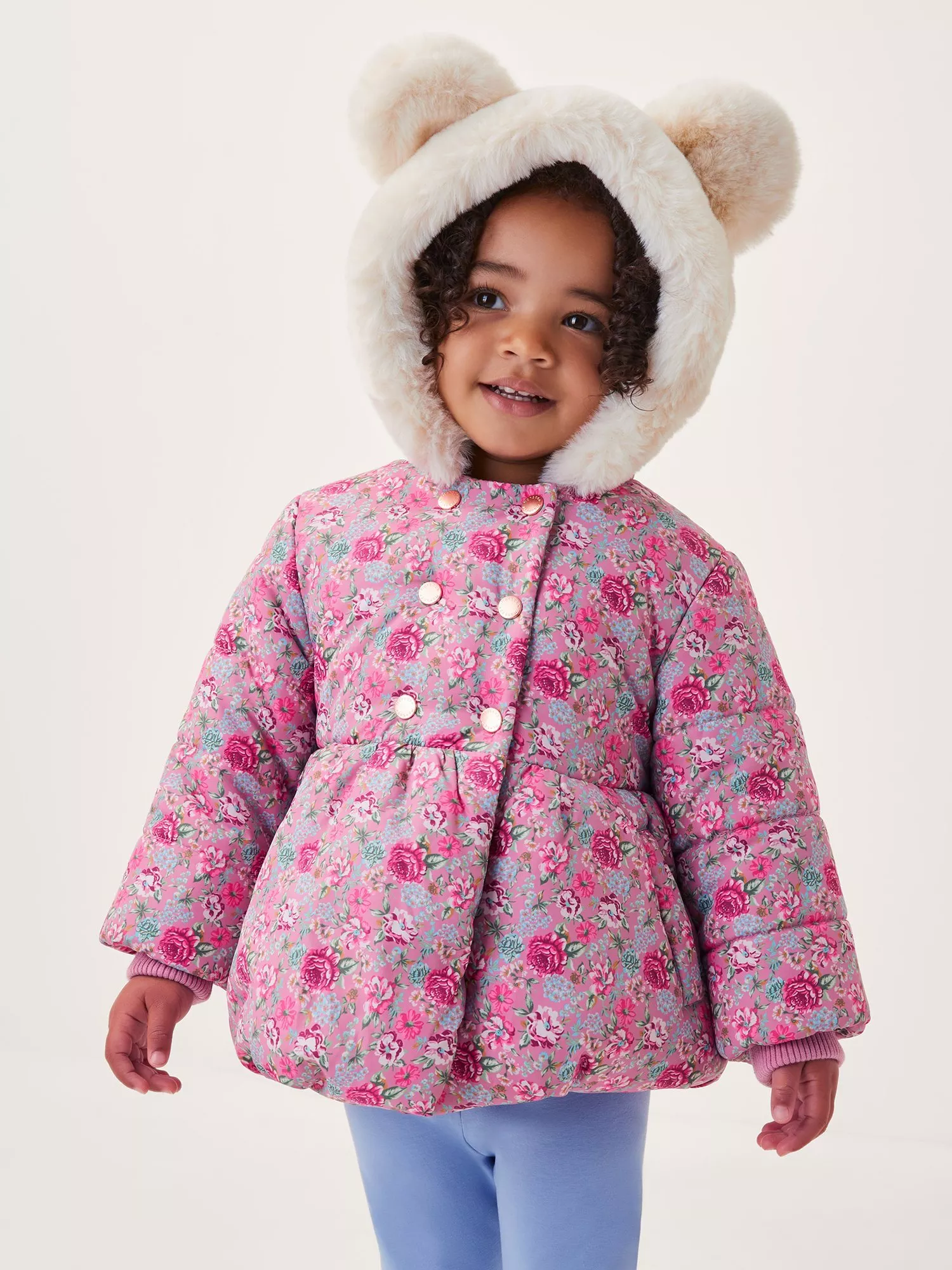 Perfectly padded to keep the cold out and cosiness in, this coat is patterned with vintage-inspired florals with double-breasted buttons to finish. The super fluffy teddy ears around the hood for ultimate cute factor.