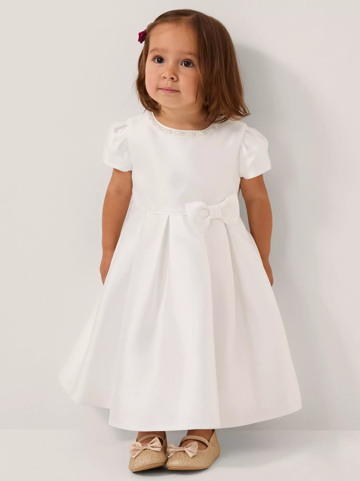 Whimsy in every detail. This dazzling dress is simply perfect for baby's first special occasions. Designed with short sleeves and a voluminous A-line skirt, it features pearly bead and diamante embellishments around the neckline. Finished with bow detailing at the waist.