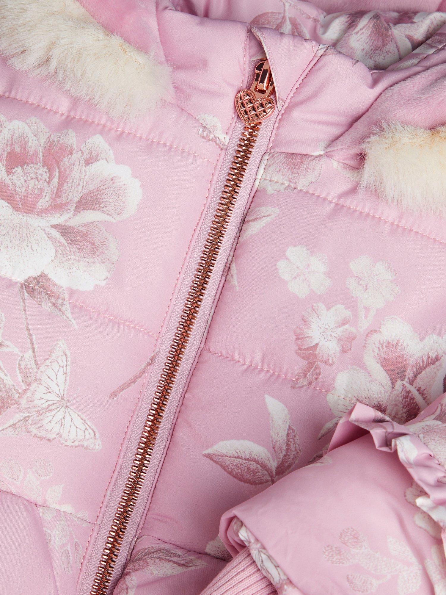 Decorated with a rose print and frill detail, this padded coat is perfect for the cooler months. It's designed with fitted cuffs, a cosy, faux fur lined hood and a simple zip fastening.