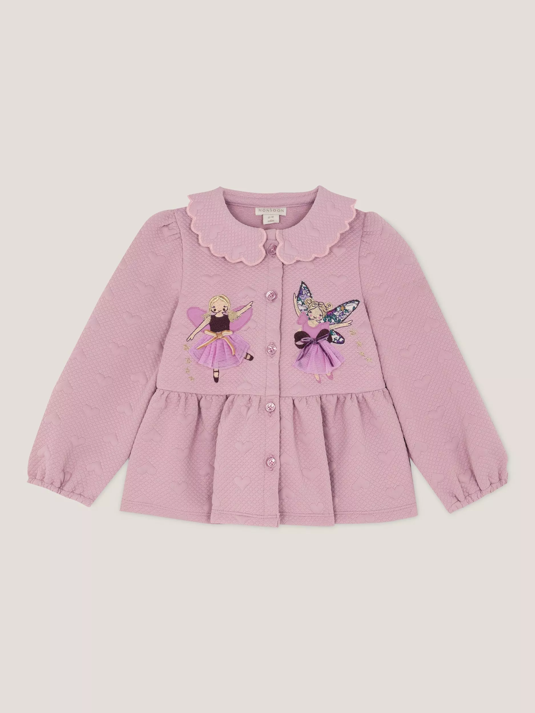 Designed in dusty pink, this jacket features a scallop collar, heart-shaped quilting and cute fairies dancing either side of the button fastenings.