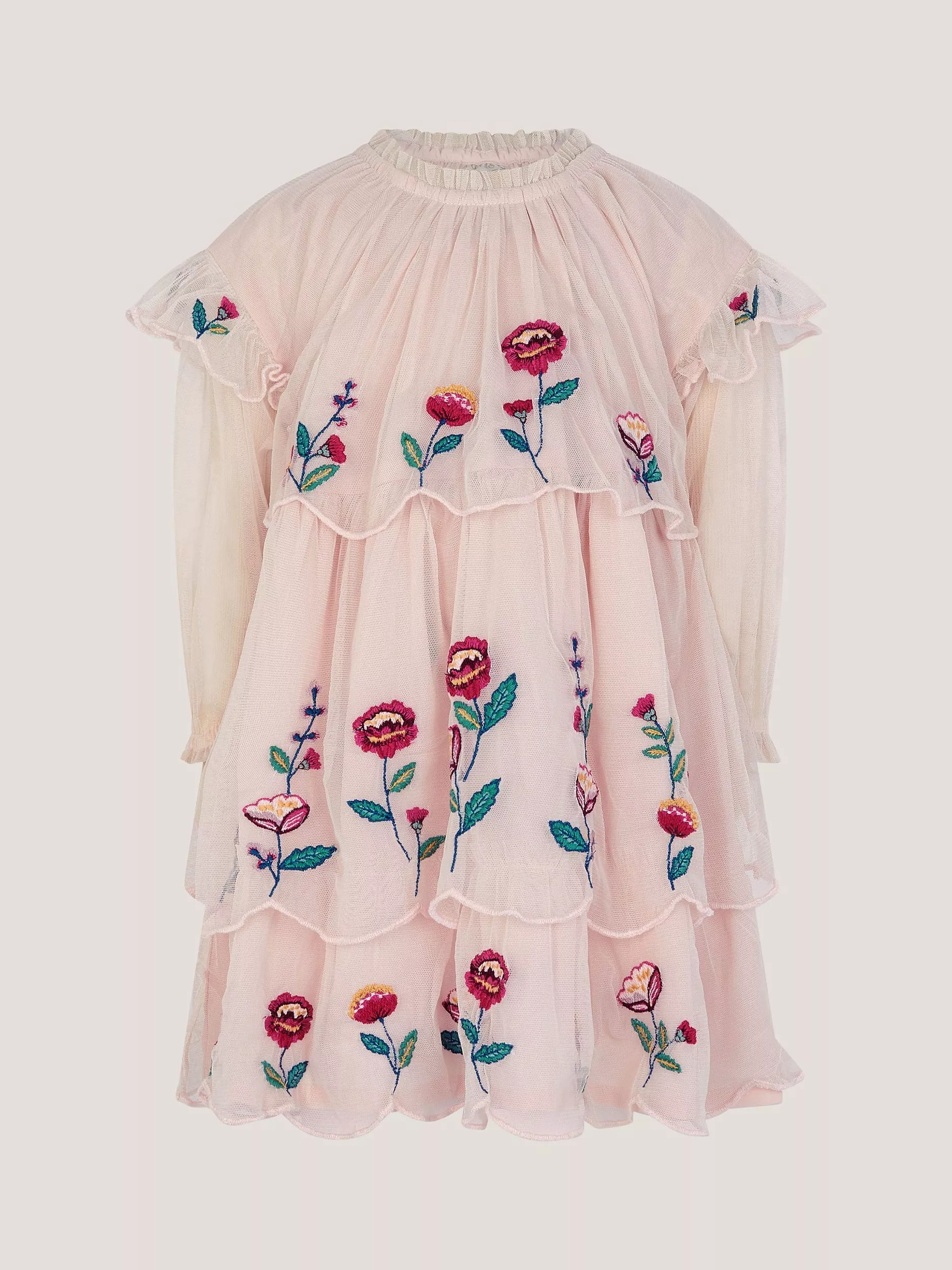 Floral embroidery adds charm to this tiered midi dress, designed for daytime adventures. The long sleeves and soft lining provide comfort while clever details offer a playful twist for any occasion.