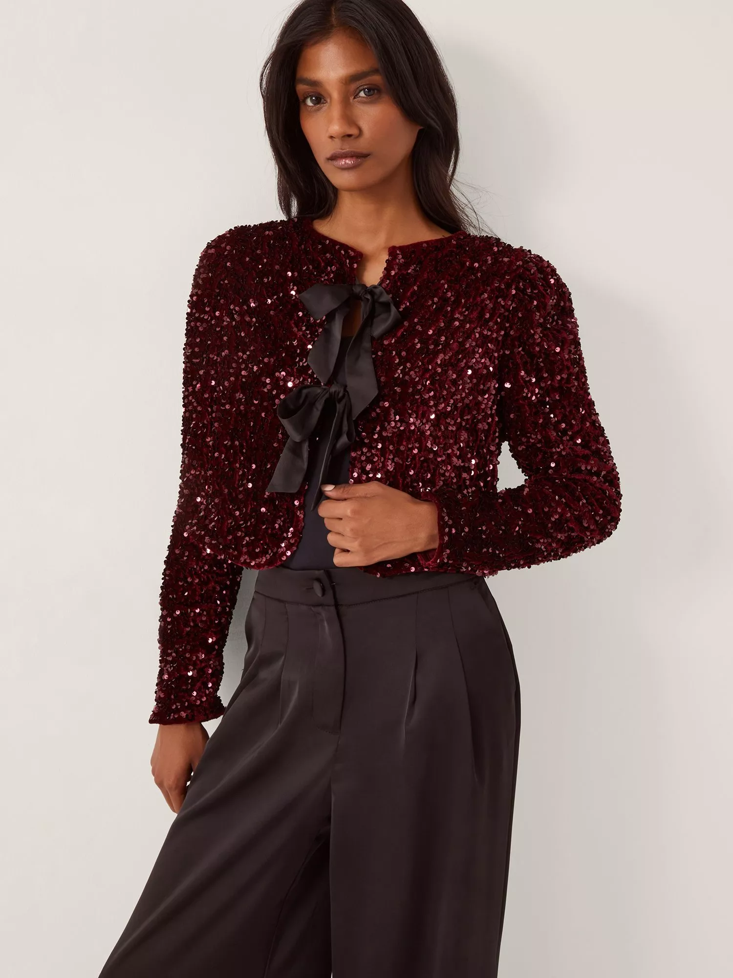 A flattering piece that layers elegantly over eveningwear attire, this bolero by Monsoon sits at the hip for versatile coverage.