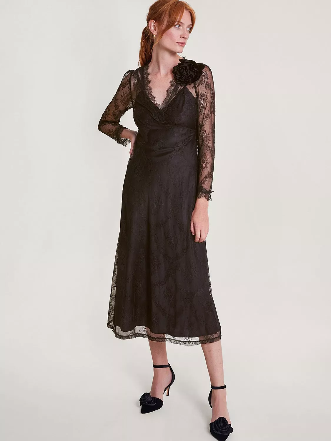 Black lace. Floral corsage. Wispy skirt. Monsoon have upgraded the LBD and made it worthy of special occasions. Topped in lace, this piece falls to midi length with a slip dress underneath for comfort. Finished with long sleeves.