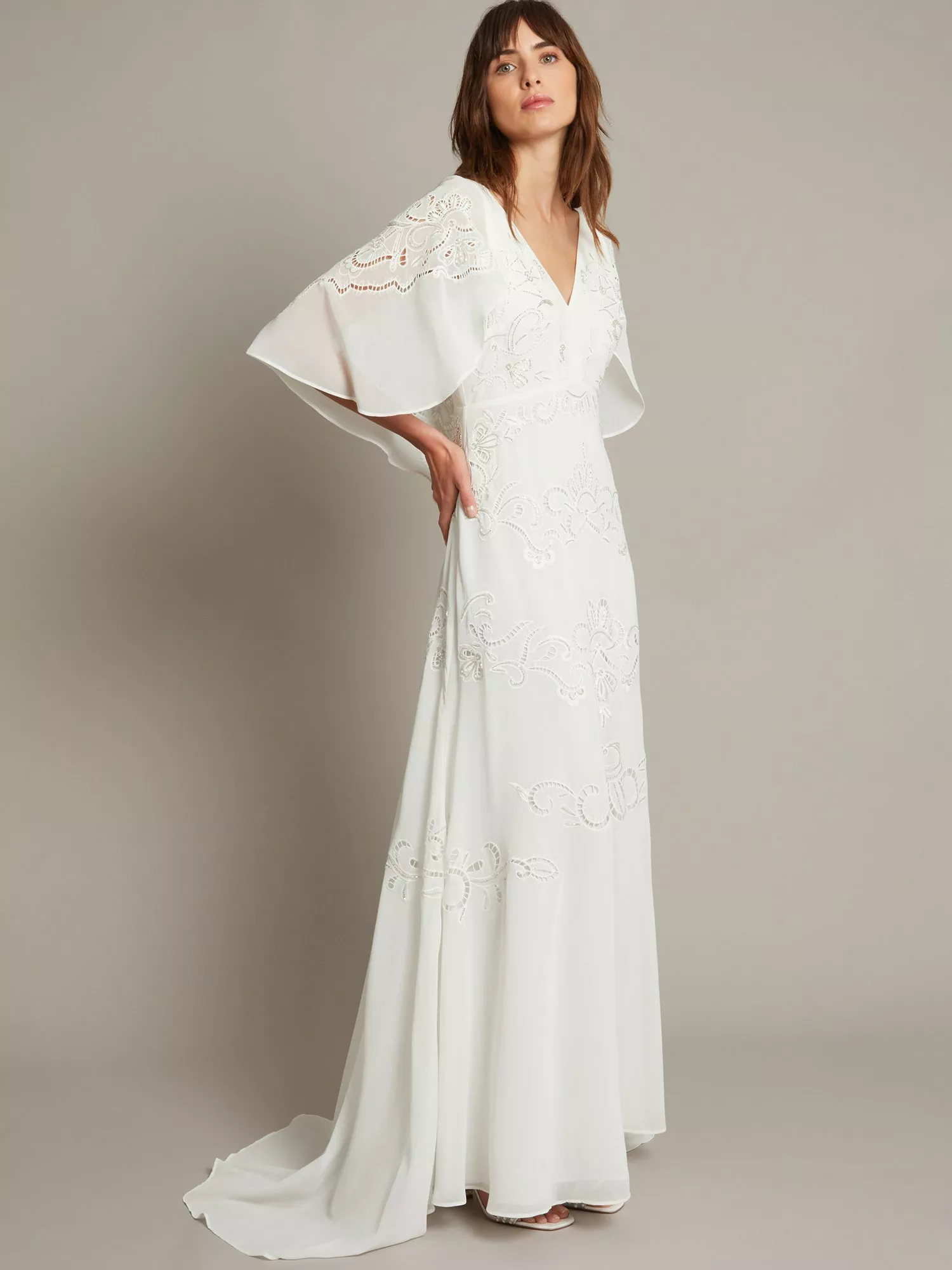 It's all in the details. With an angelic cape sleeve that drapes over the shoulders beautifully, follow the cut-out embroidery through the maxi length silhouette and glisten amongst the silver bead embellishments. The loose silhouette is fit for the relaxed wedding, providing space to move, mingle, and party into the reception. Finished with a v-neckline and zip fastening on the reverse.