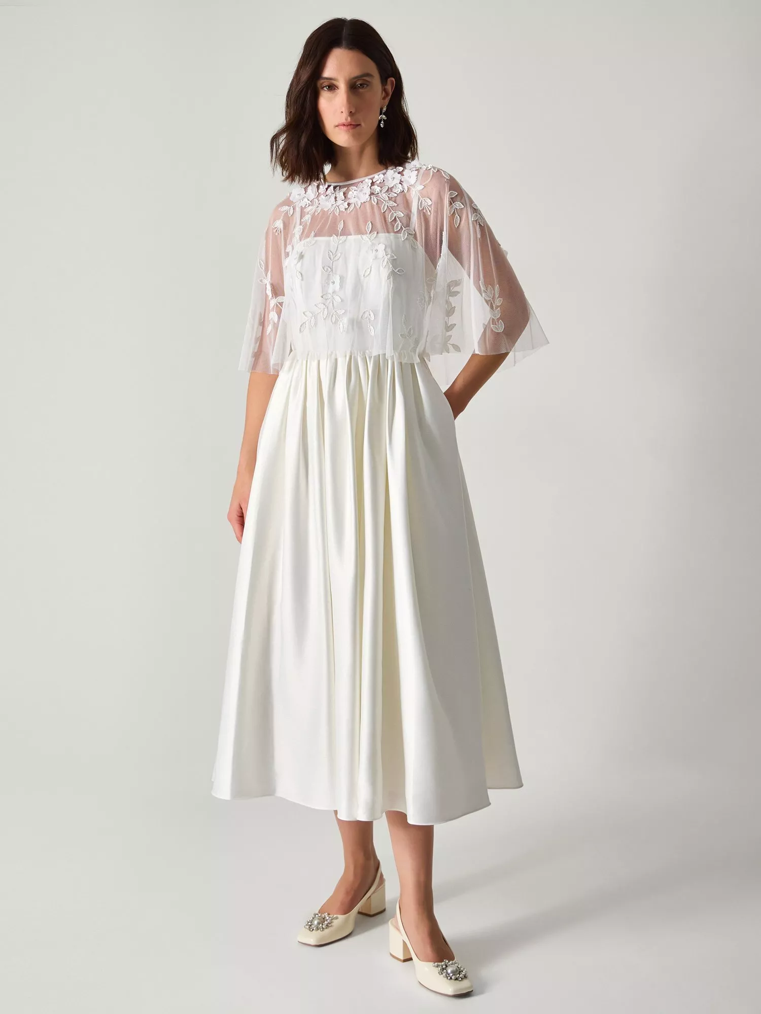 This satin midi bridal dress features a softly flared silhouette with a round neck, sleeveless design and dramatic cape detail, offering comfort and elegance for your special day. It's simple style lets you express yourself with confidence and charm.