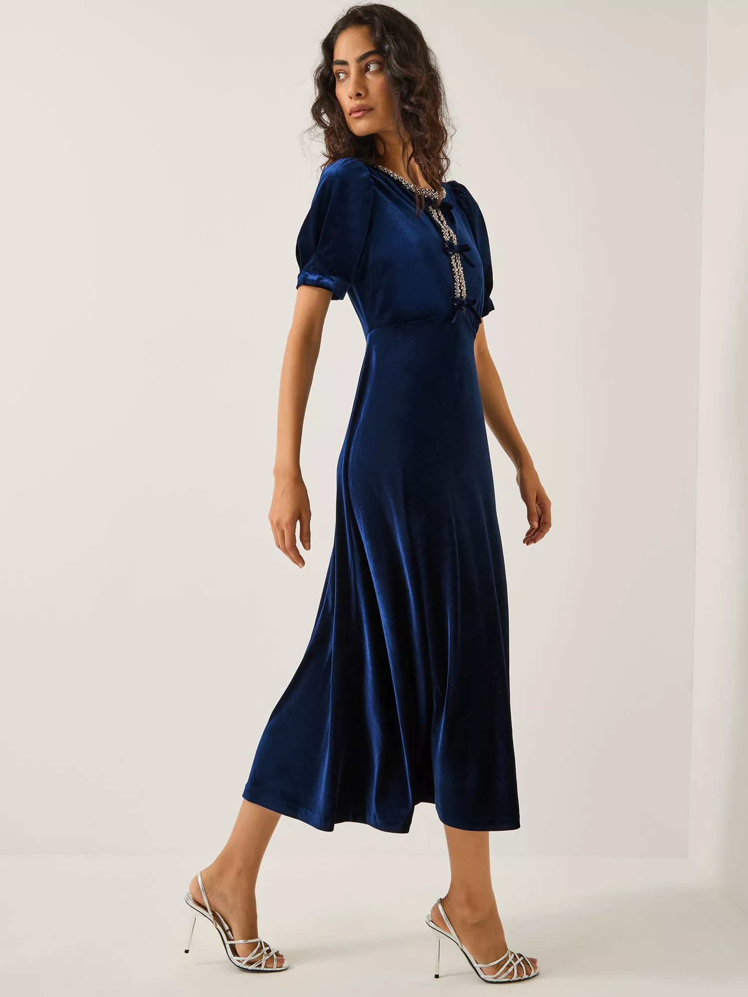 Designed in the fabric everyone loves to show off during the party season, this velvet number will dazzle and turn heads. Framed with puff sleeves and sparkly embellishments around the neckline and bodice, it's finished with a trio of bows through the front.