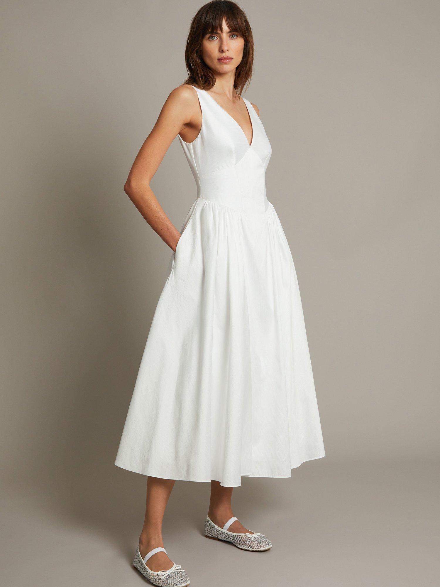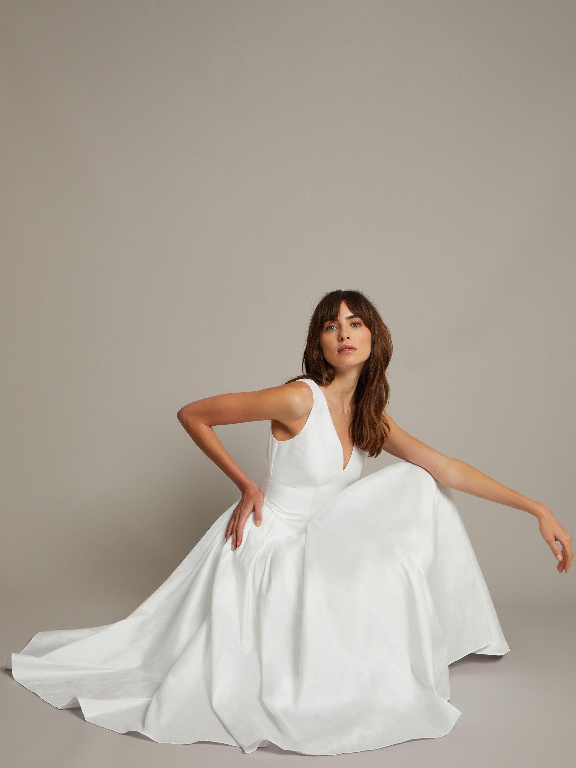 Timeless. There's a reason this silhouette has been popular since the 1950s, and it's all about the flared midi skirt (and pockets). Simple and elegant, this snug bodice boasts wide straps that'll keep you feeling secure all-wedding-long. Dress it up with colourful accessories if you're feeling daring, or opt for neutrals and keep it classic. Fastens with a zip on the reverse.