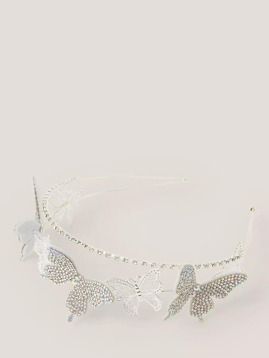 The perfect finishing touch to all their occasion looks, this headband is dipped in a silver tone and adorned with diamanté butterflies.