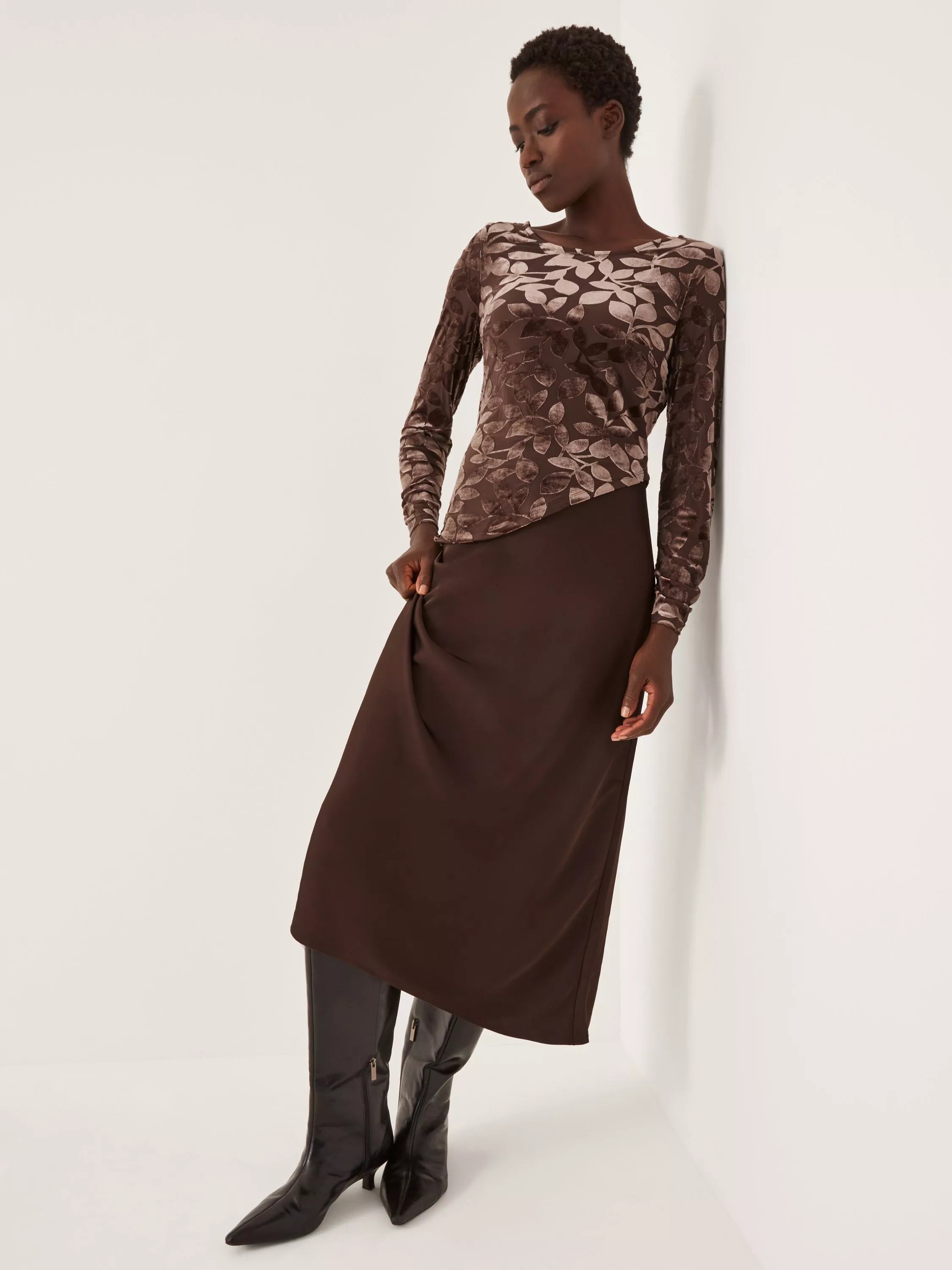A velvet midi dress from Monsoon, featuring a scoop neck and playful asymmetric waist. Designed with a devore leaf-inspired patterned bodice, the long sleeves provide comfort as you move confidently through any occasion.
