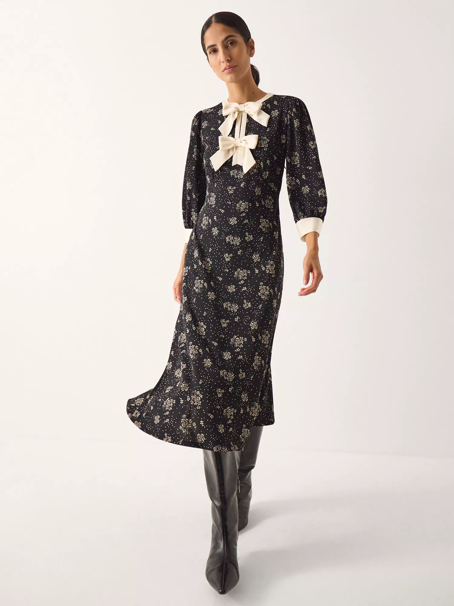 A midi jersey tea dress by Monsoon. The round neck and three quarter sleeves keep things fresh, while the dotty bow floral pattern is one you'll love to wear.