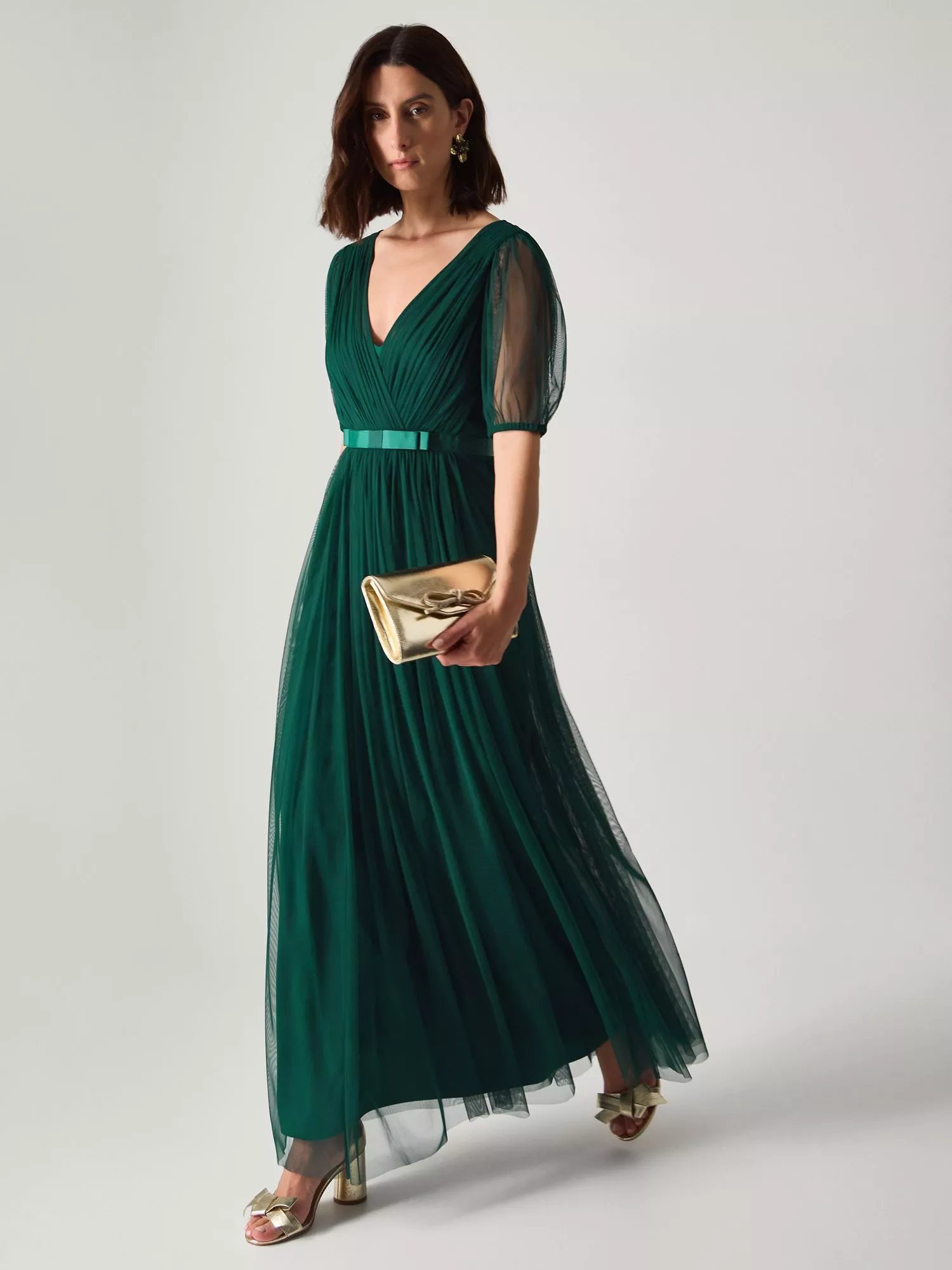 A pleated maxi dress by Monsoon. The fit and flare design flatters your shape, while the V-neck, short tulle puff sleeves and satin waistband make for the perfect finishing touches.