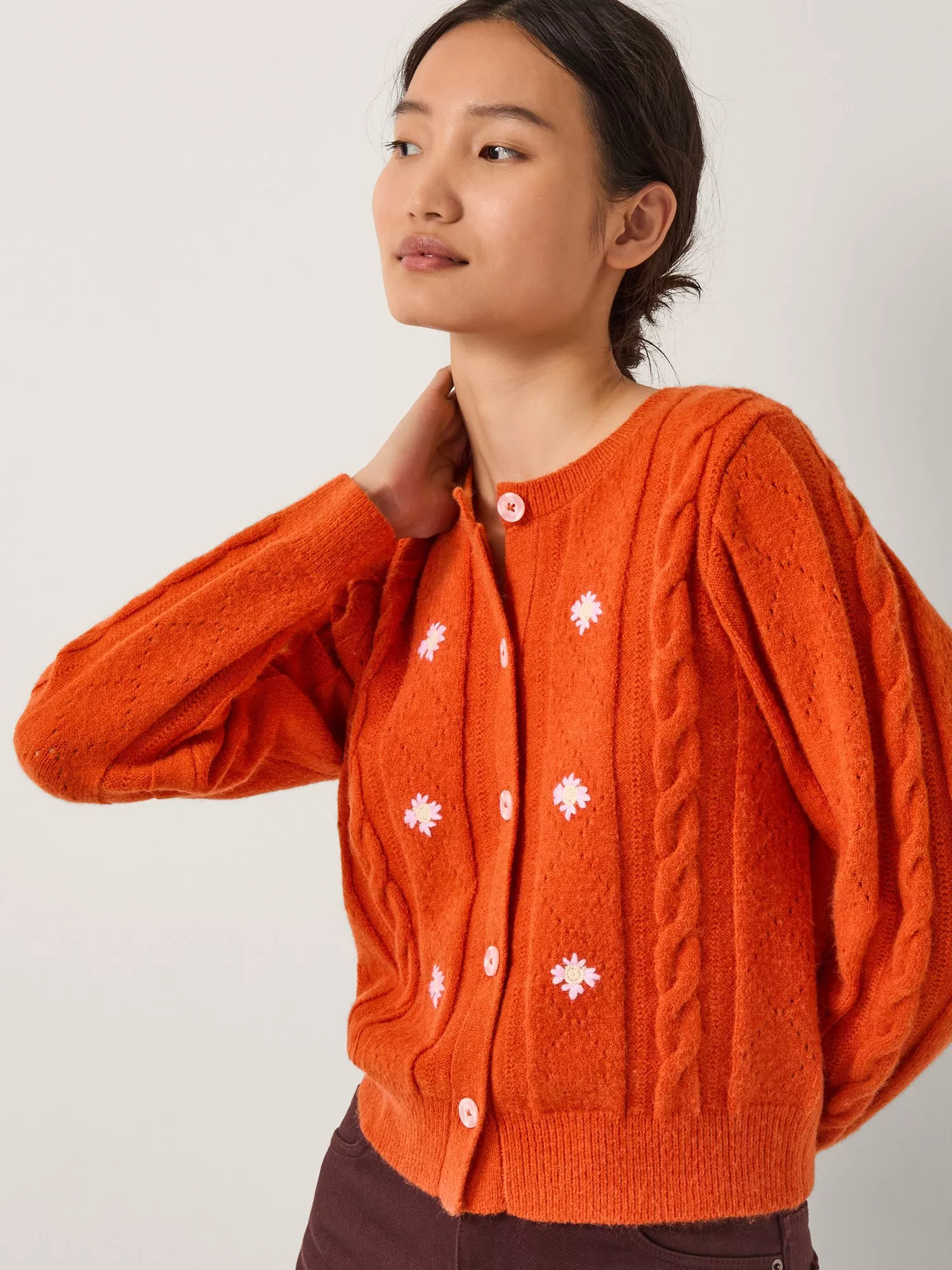 Give your knitwear collection the pop of colour it deserves. Stitched in a cable knit design, this cardigan from Monsoon is embroidered with a trio of flower motifs either side of the button fastenings.