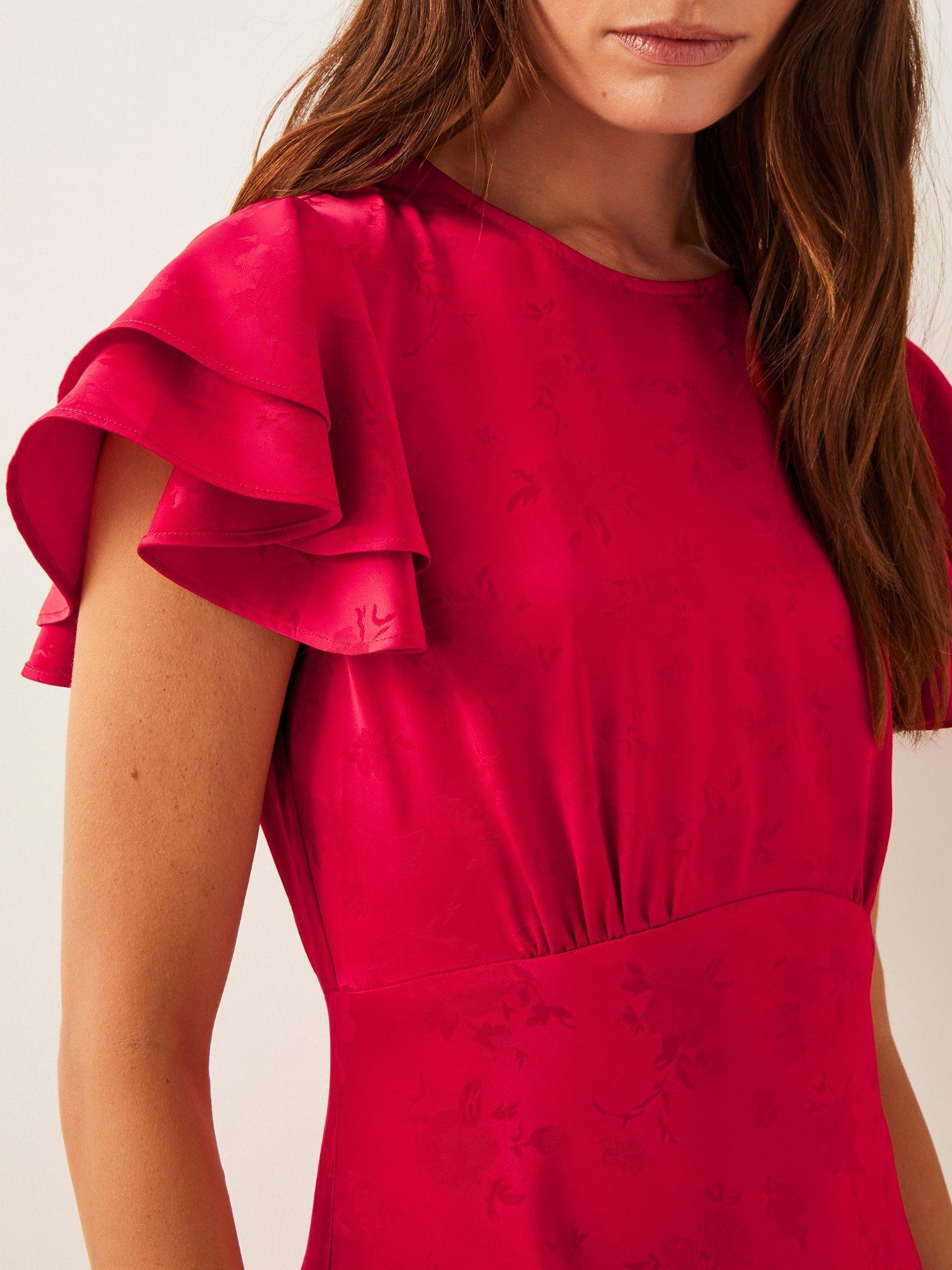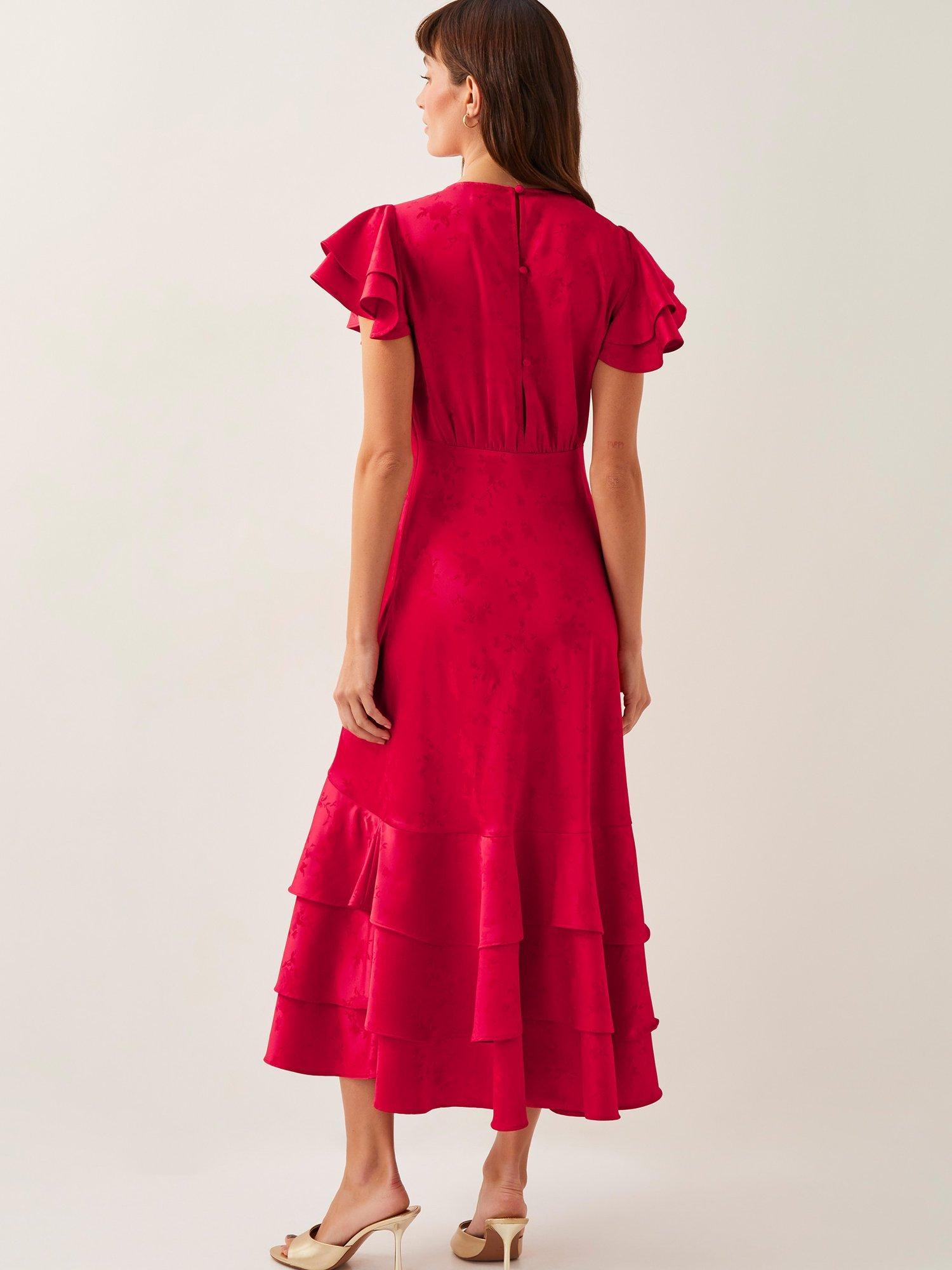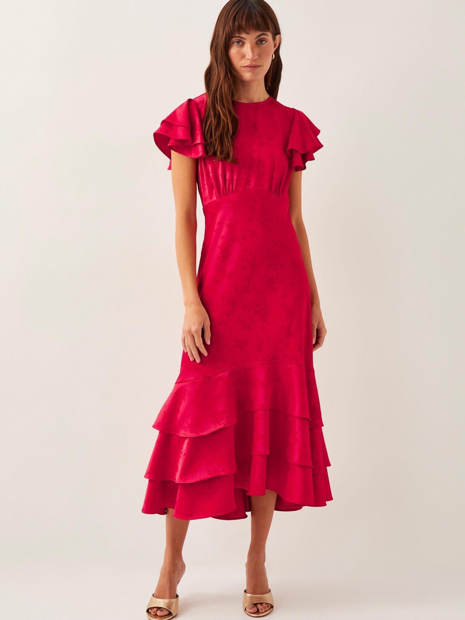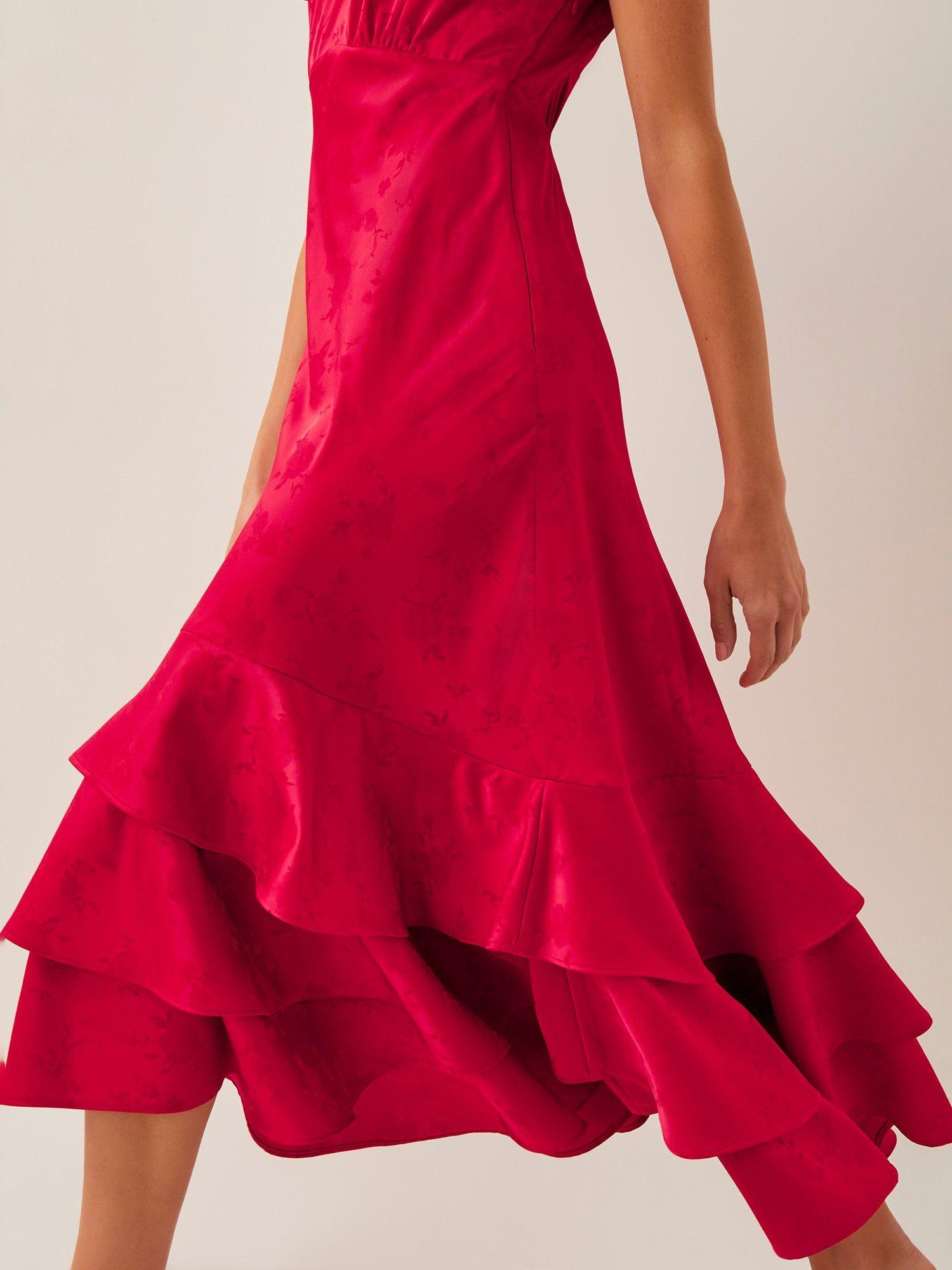 Tiers of joy. Designed in a beautiful satin fabric with subtle florals throughout, this midi dress is finished with tiering ruffles at the sleeves and hem, creating a look that'll swish and sway effortlessly with every stride.