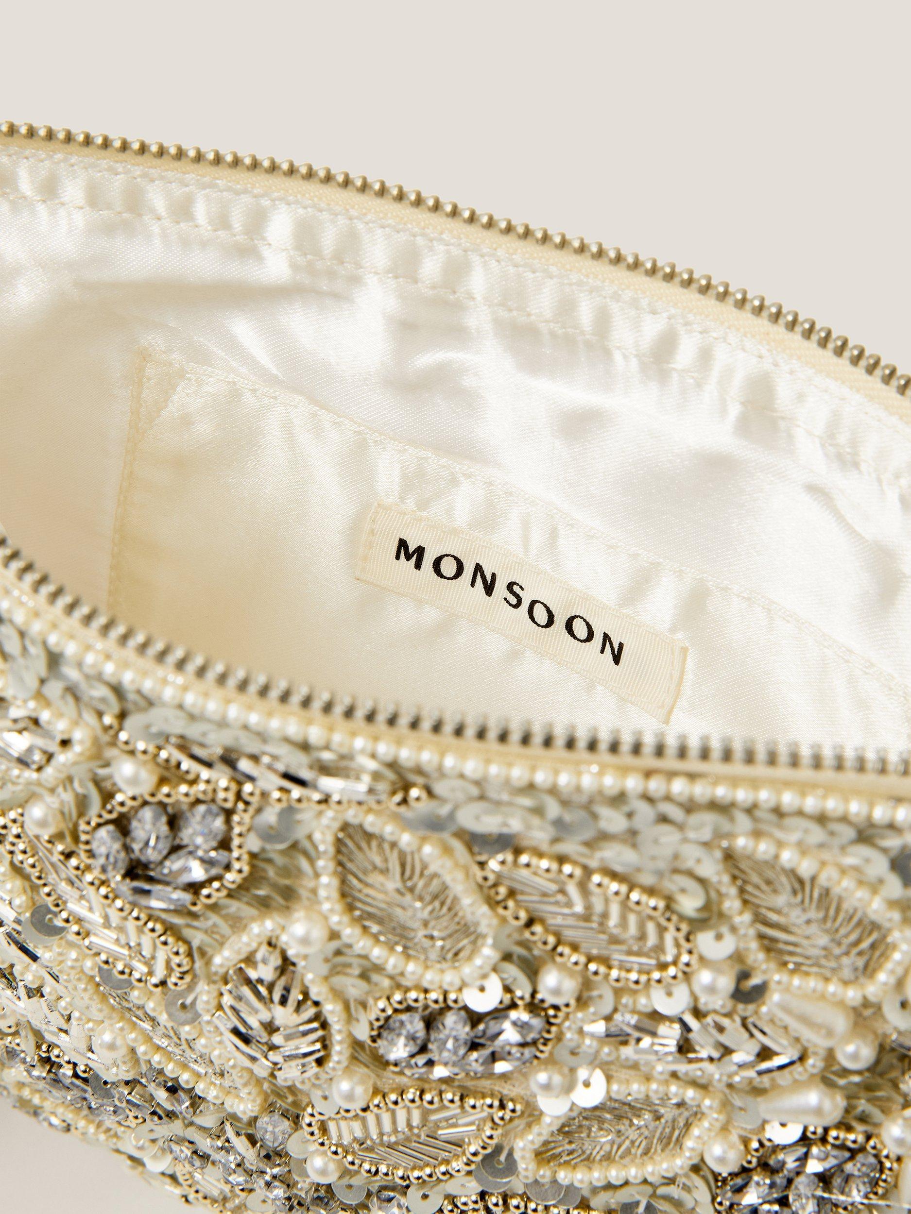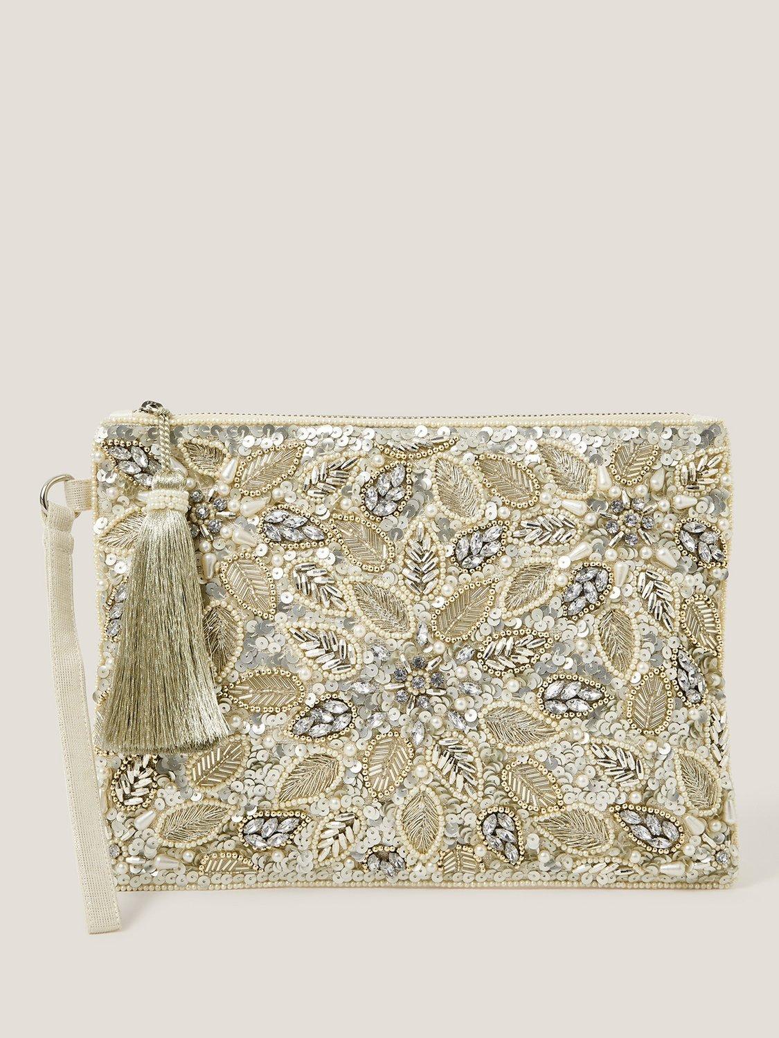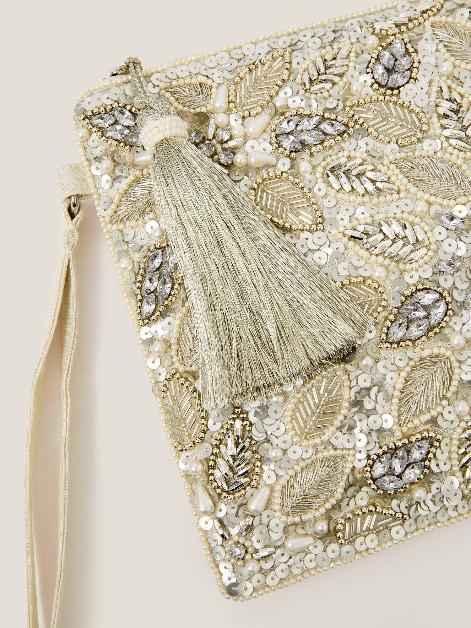 The perfect date. Whether you're attending a wedding or dinner party, this glitzy pouch will be by your side all night. Completely covered with faux pearls, gemstones and sequins, it's designed with a hand strap for hands-free dancing. Finished with a matching tassel.