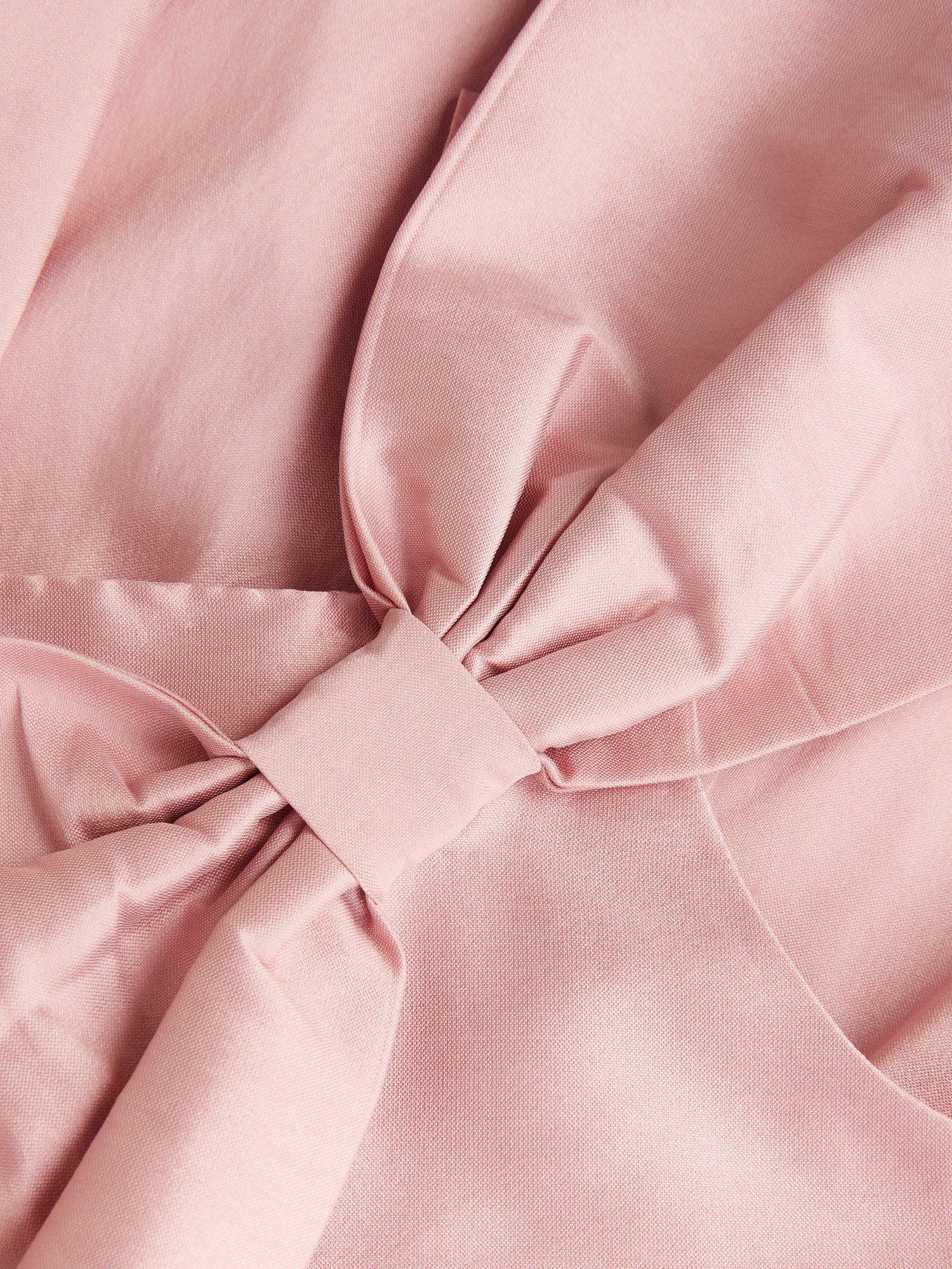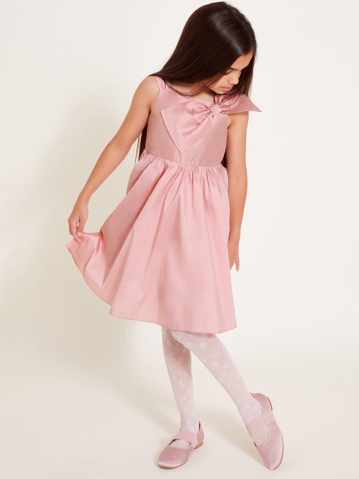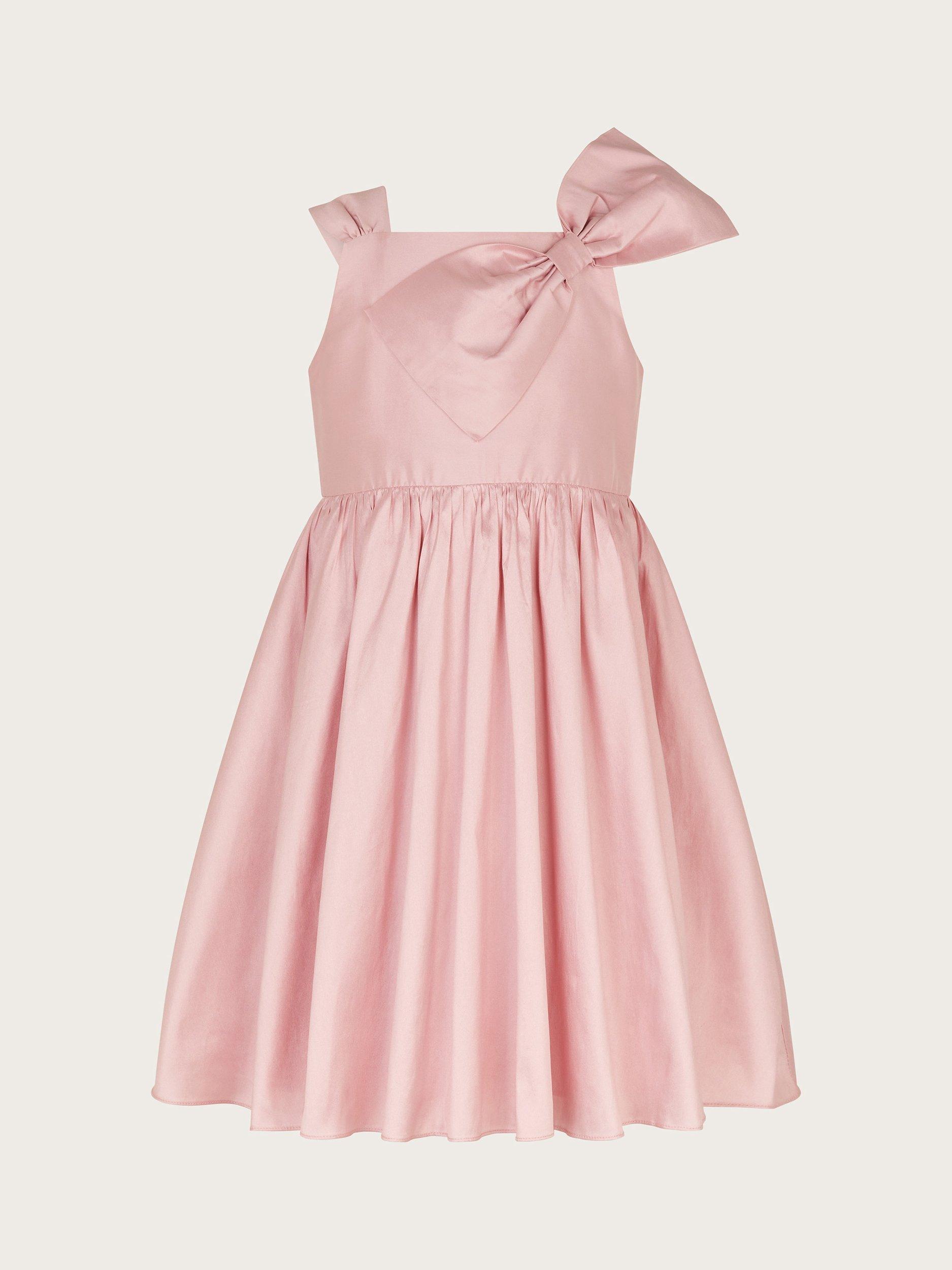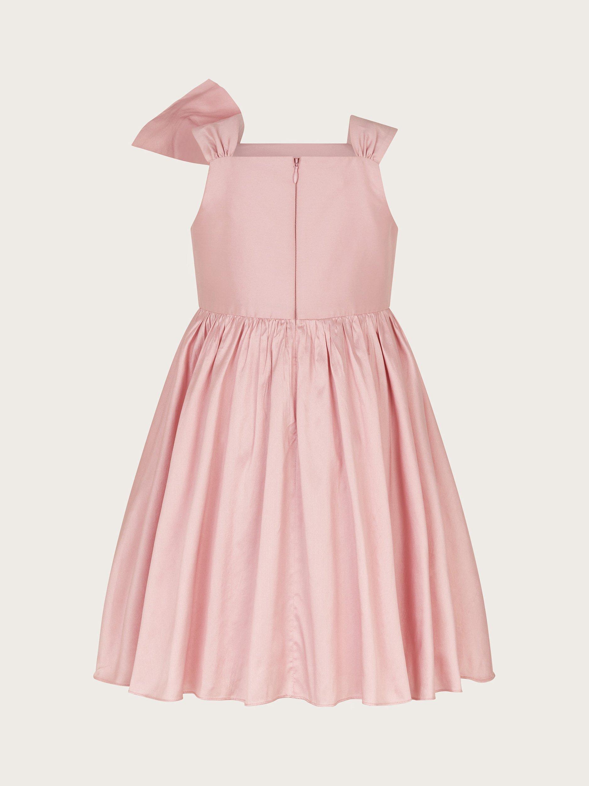 Spun in crisp, shiny taffeta, this dress brings an elegant touch to their party looks. The snug bodice is designed with an oversized bow to one shoulder, falling into an A-line skirt.
