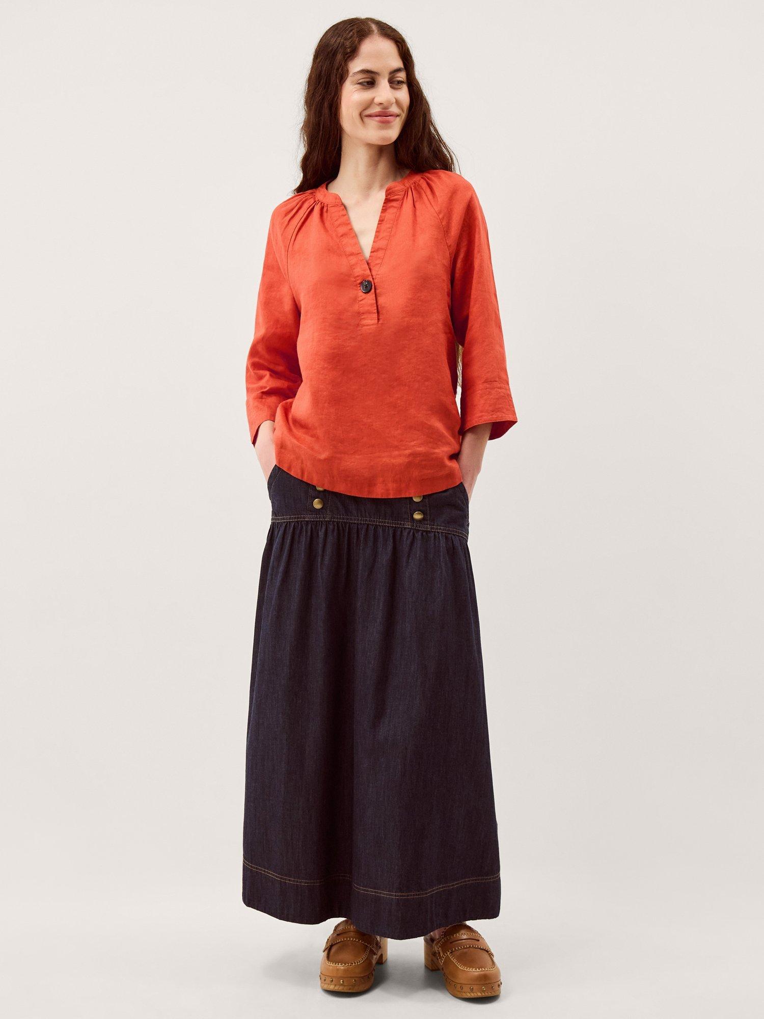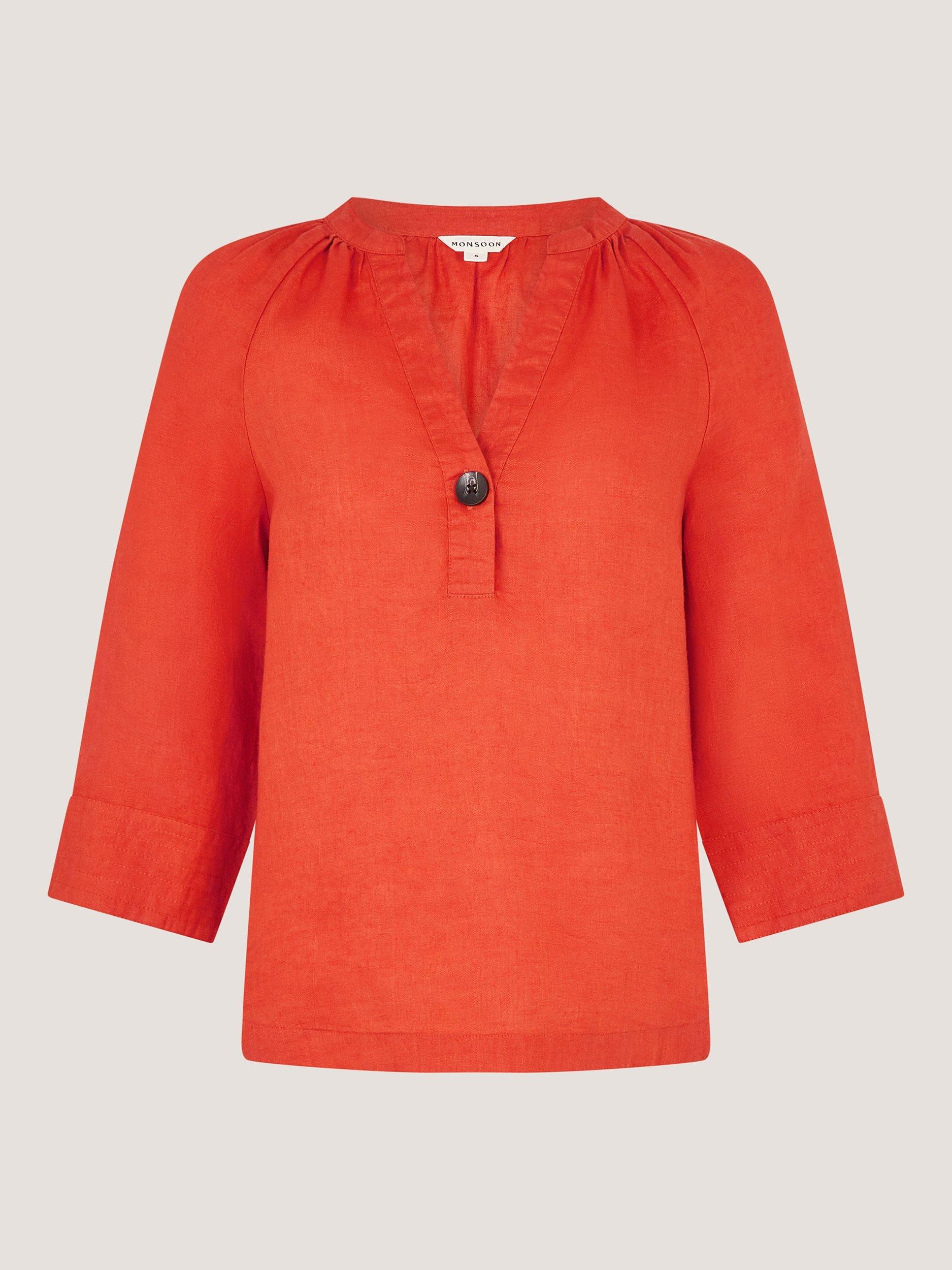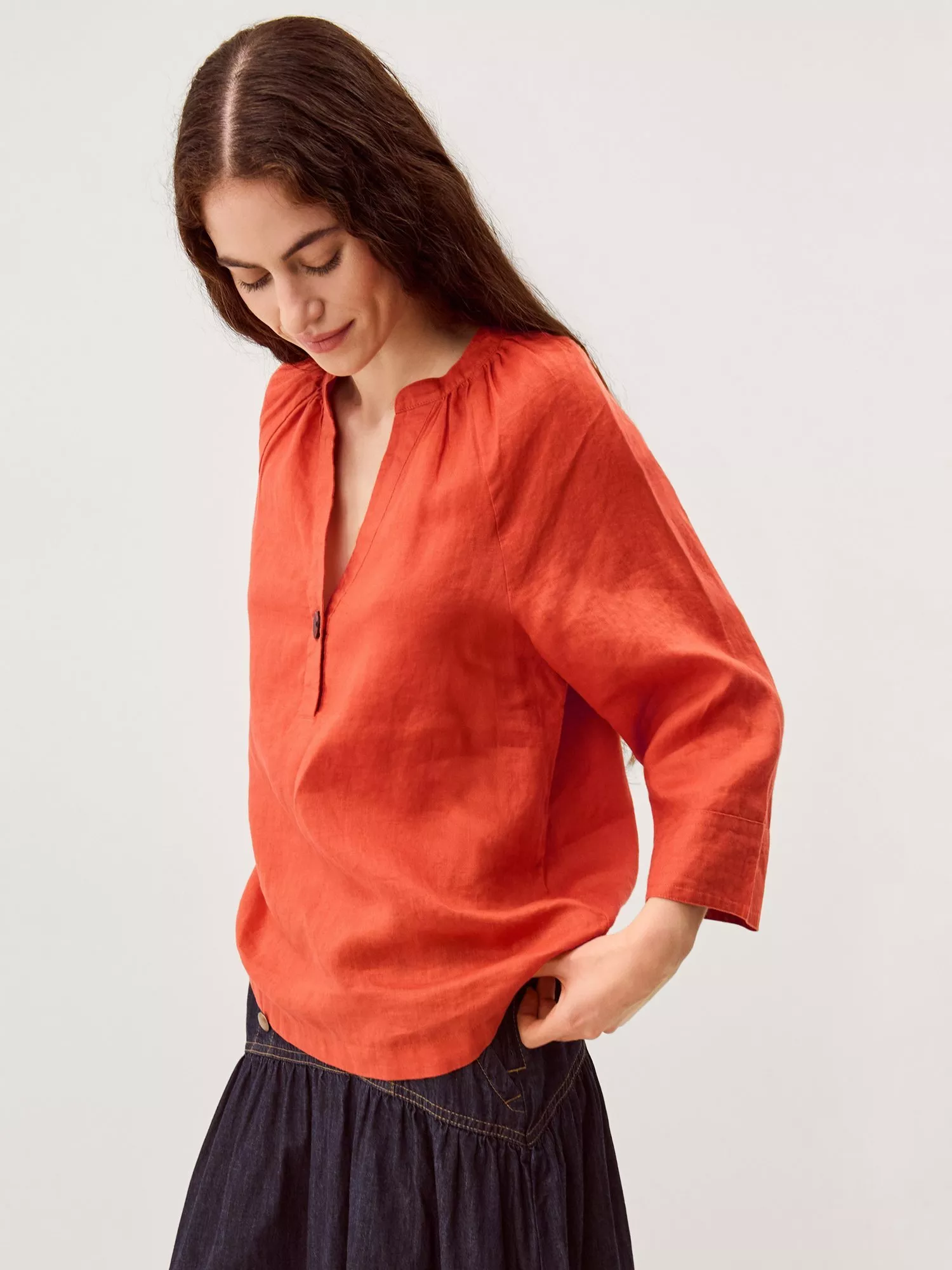 This lightweight linen T-shirt keeps you cool and comfortable all day. With a button-neck and three-quarter sleeves, it offers a fresh option for relaxed afternoons and catch-ups with friends.