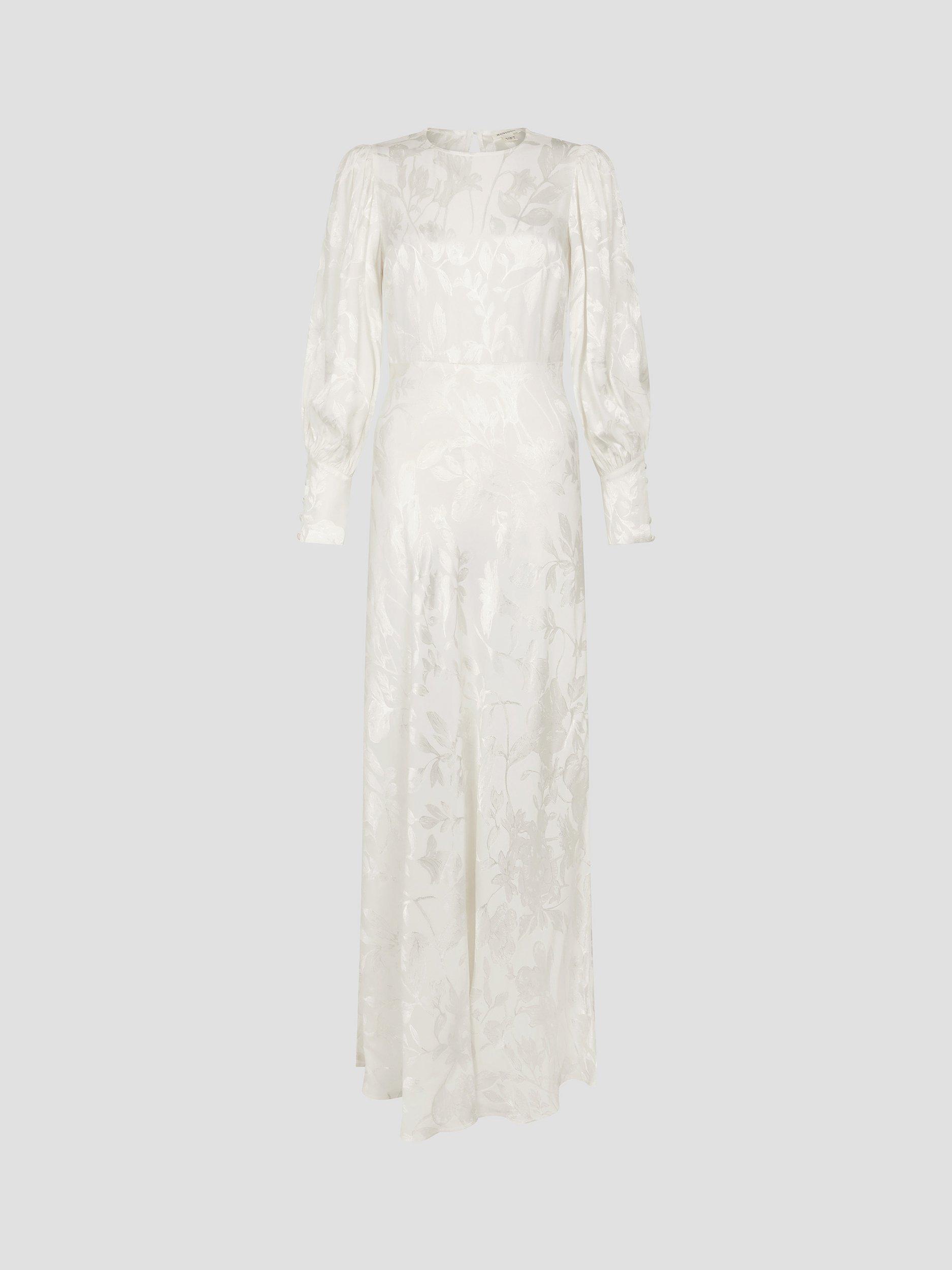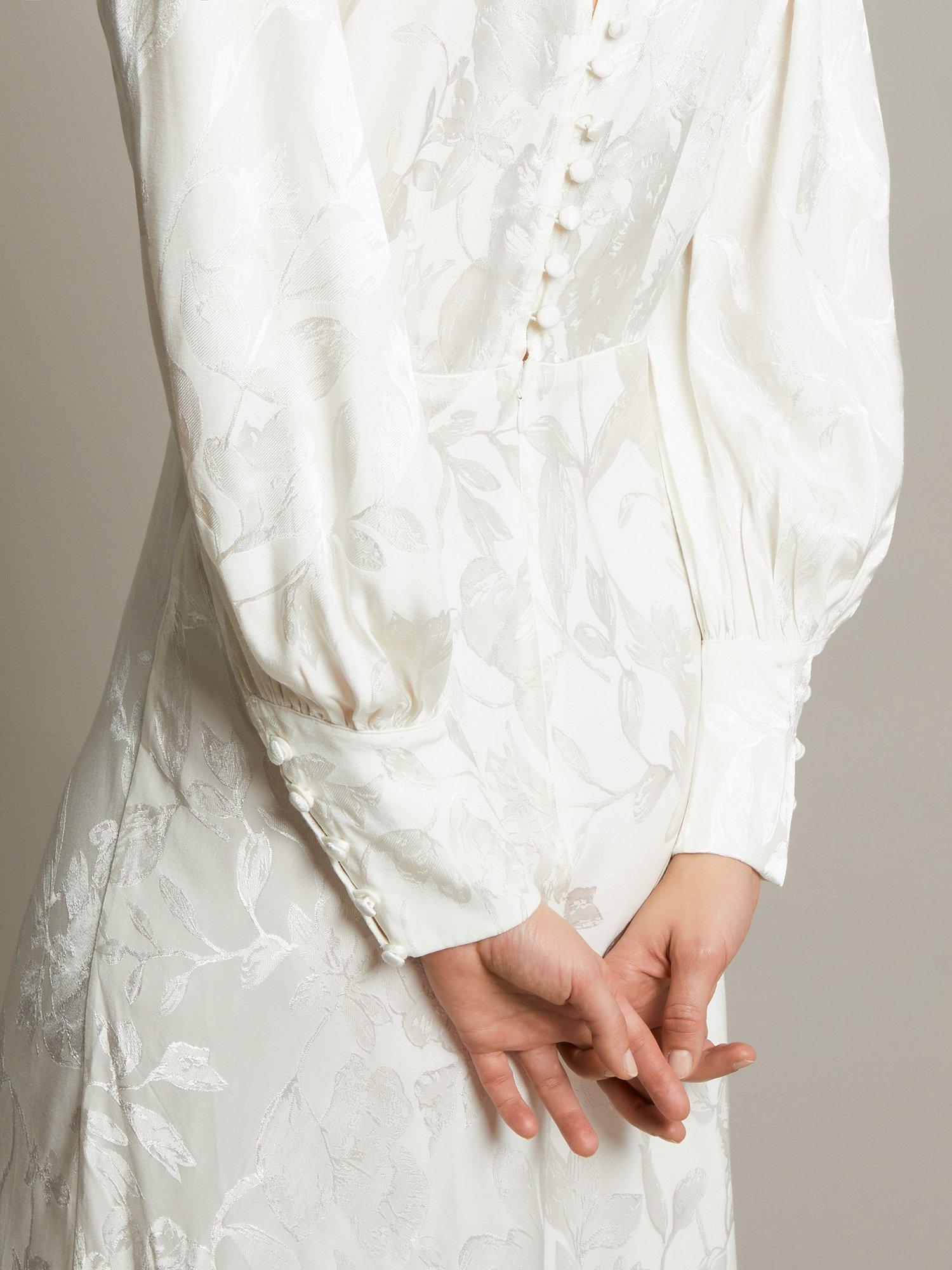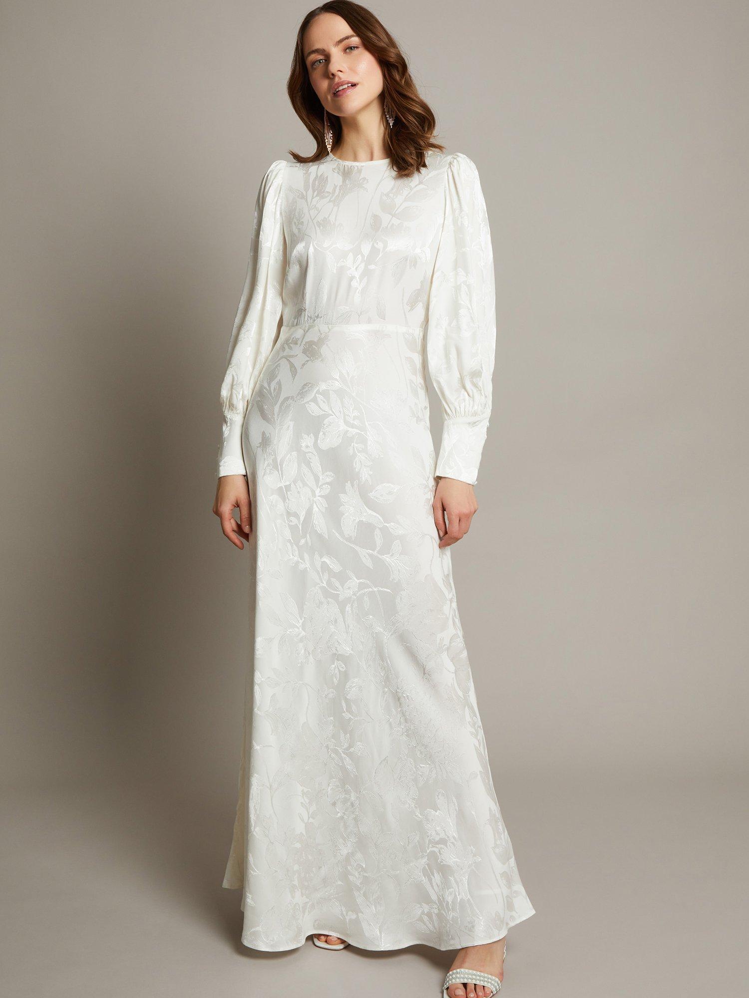 Simply elegant. The perfect pick for the understated bride, this satin number is subtly decorated with floral motifs over the luxuriously soft fabrication. Designed in a modest silhouette with a form-fitting bodice and waistline, floor-sweeping hem and long buttoned cuffs on the sleeves for a slightly vintage feel.