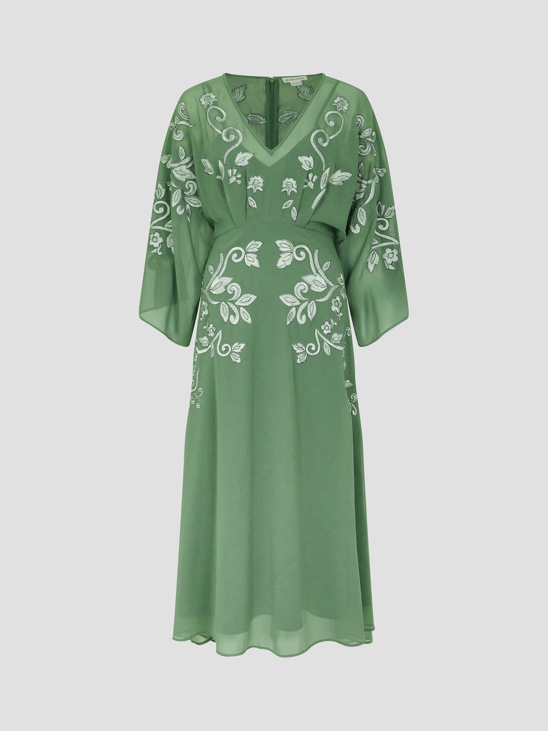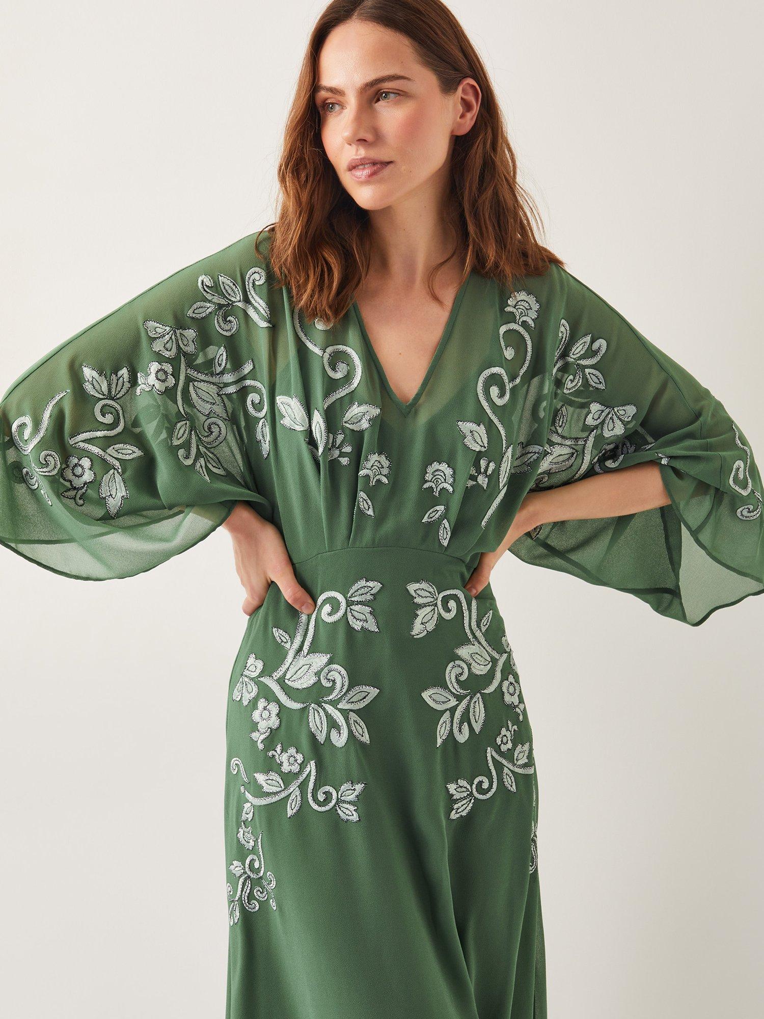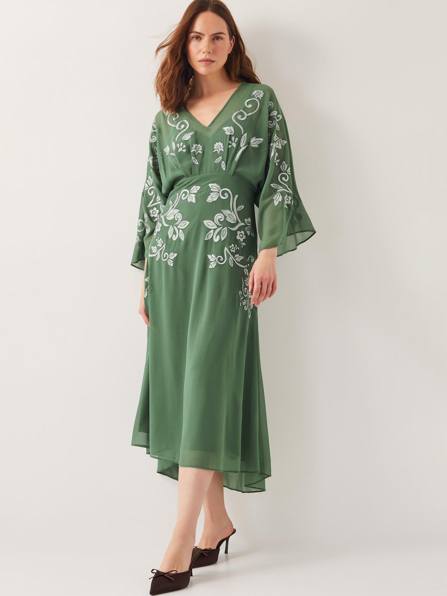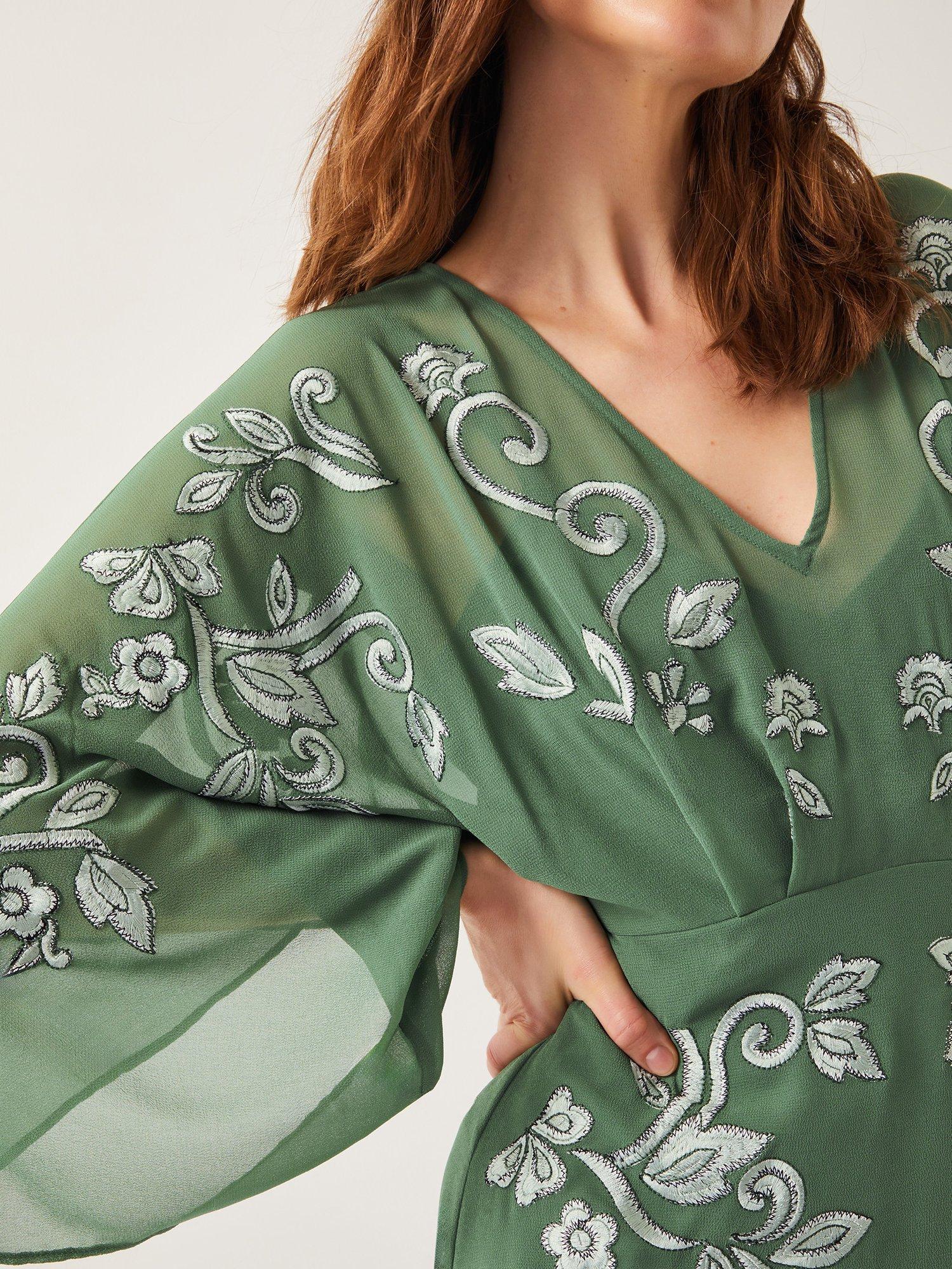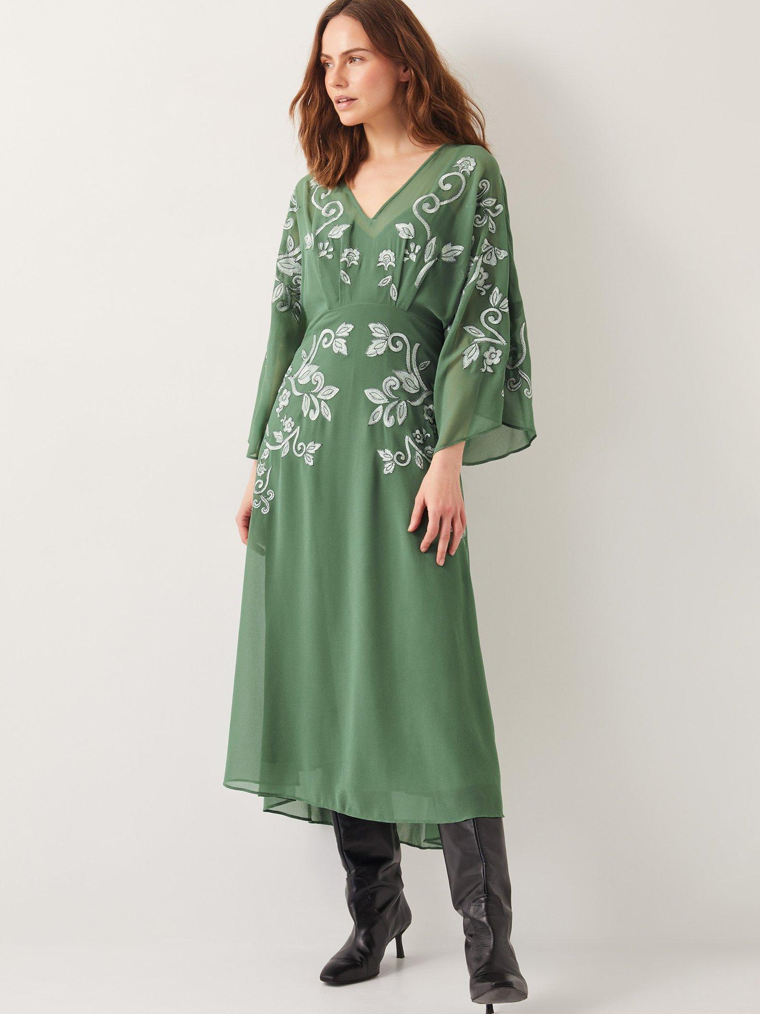 Designed with a waist-defining empire, this mid-length dress from Monsoon is made from a lightweight fabric. Effortlessly flattering thanks to a fuss-free v-neckline and three quarter length sleeves, it is peppered with embroidery.