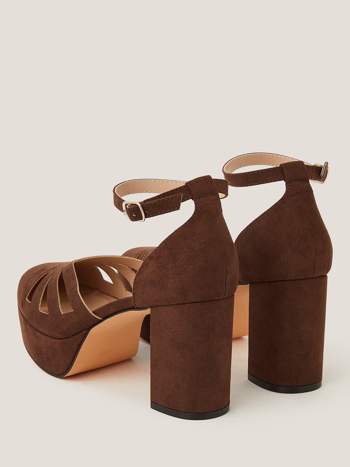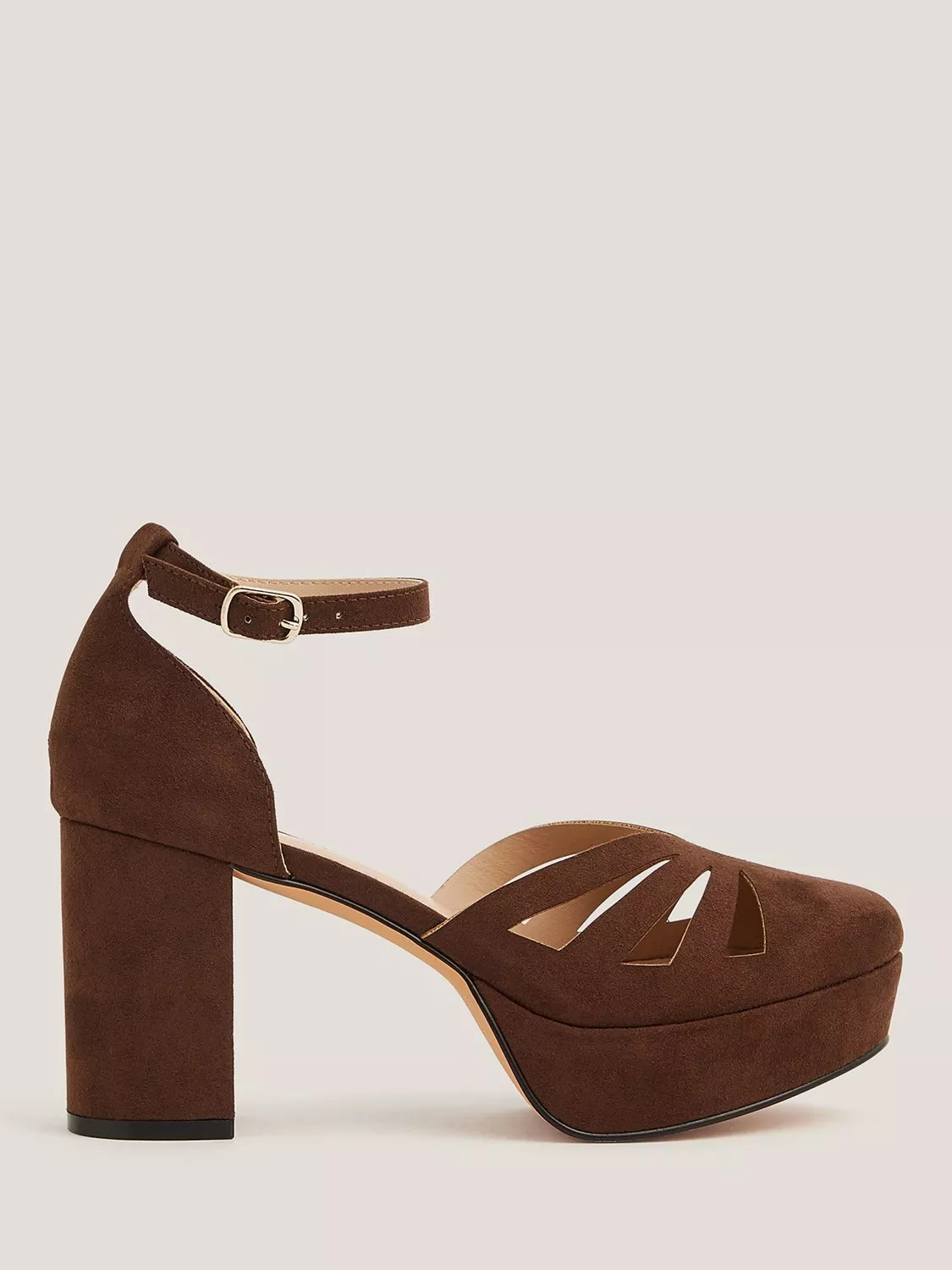 A statement pair ready to elevate all your party looks, these platforms feature a closed toe with cutwork details and a chunky block heel. Finished with a buckle strap fastening around the ankle.