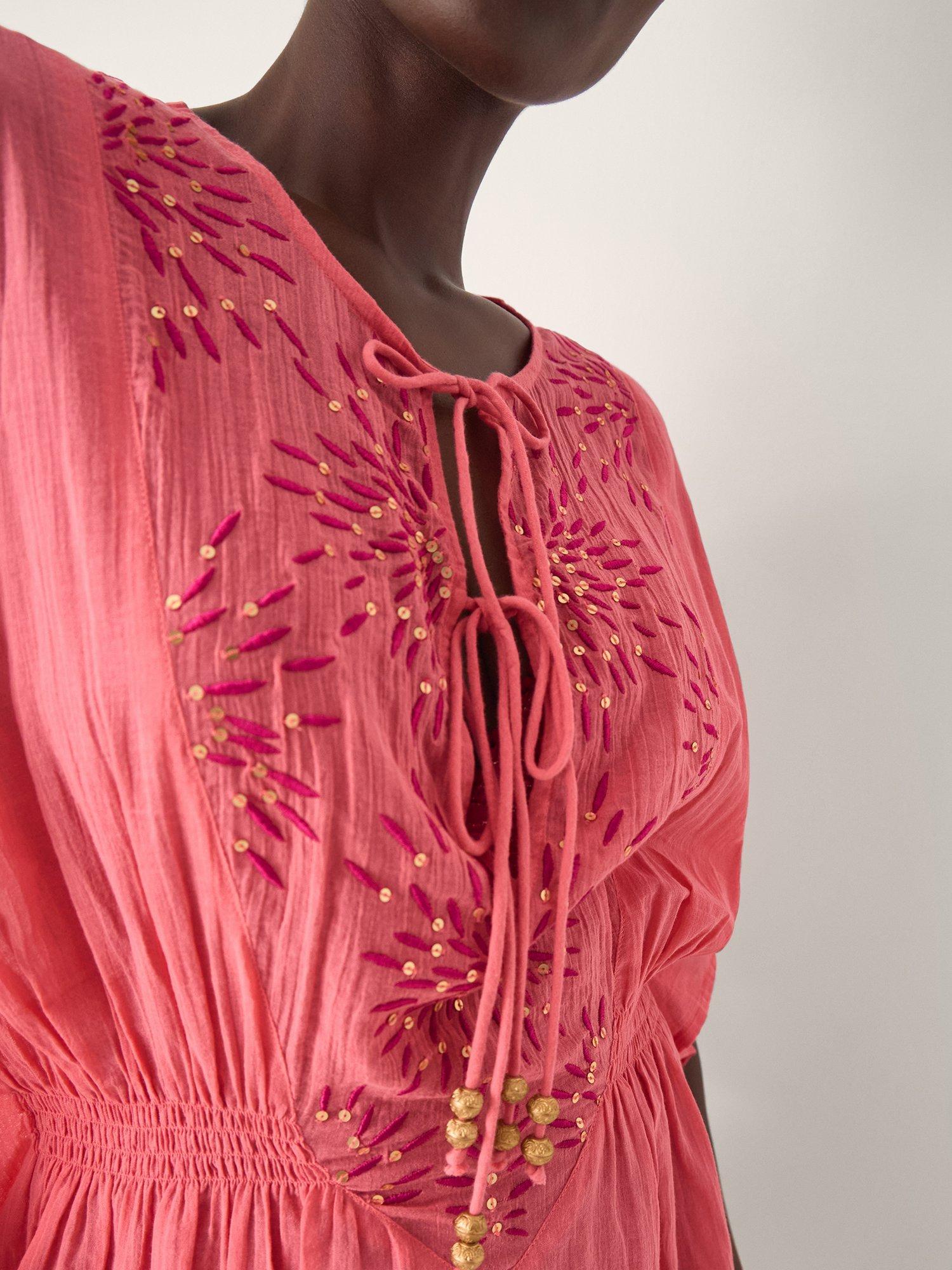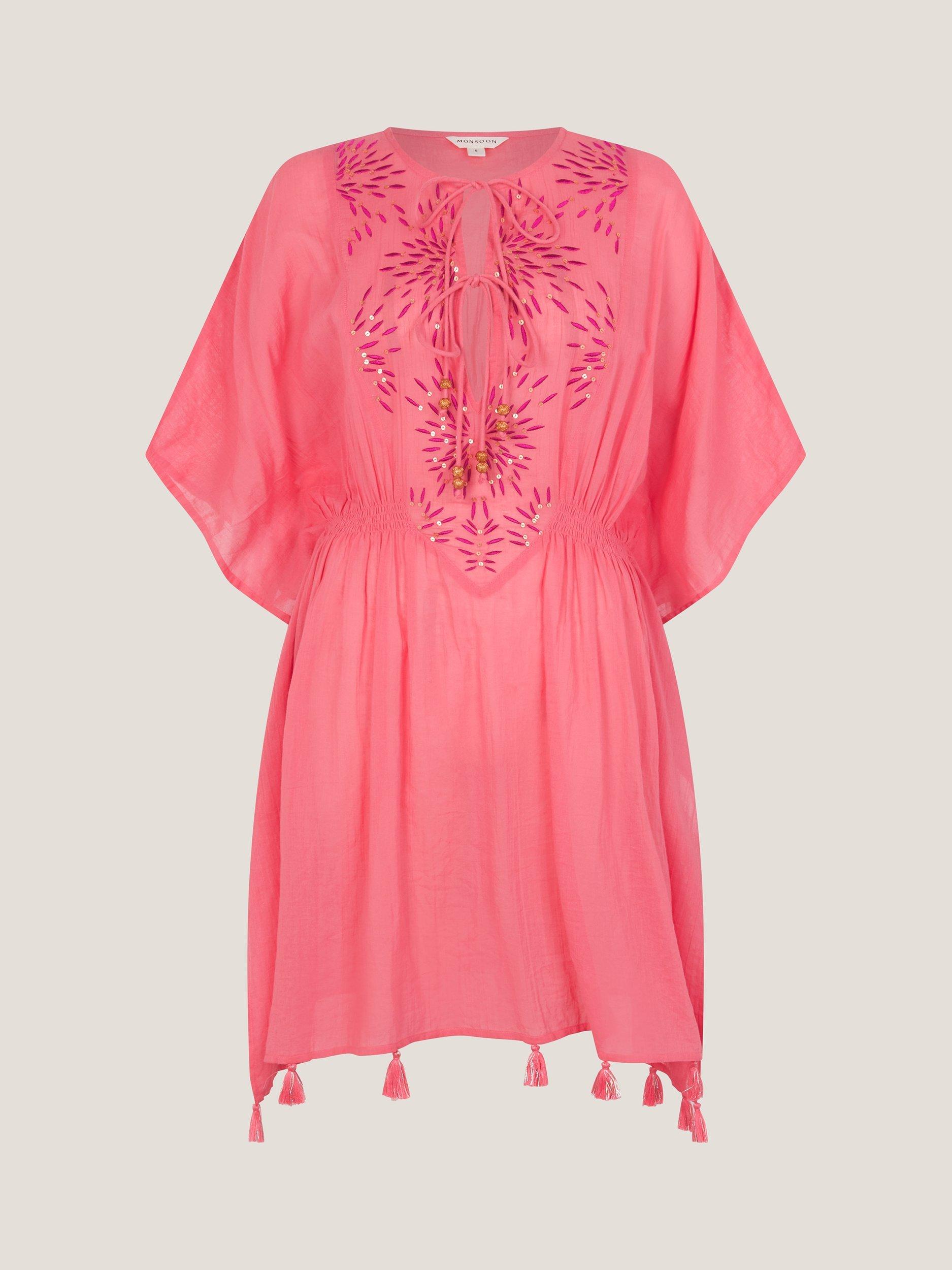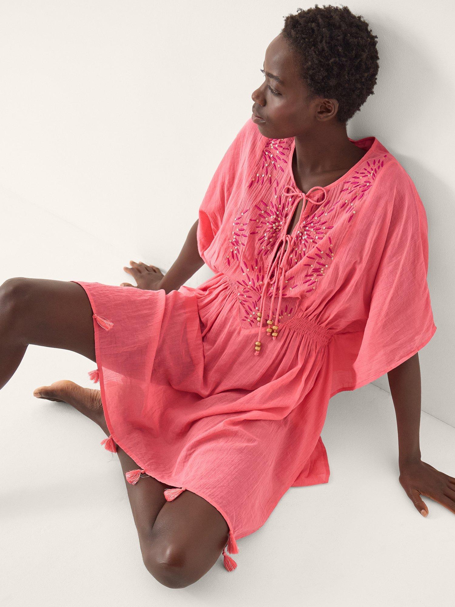 Step into holiday mode with this mini kaftan. The soft cotton and short sleeves let you stay comfortable by the pool or at the beach while its eye-catching embellishment brings a spark to your look.
