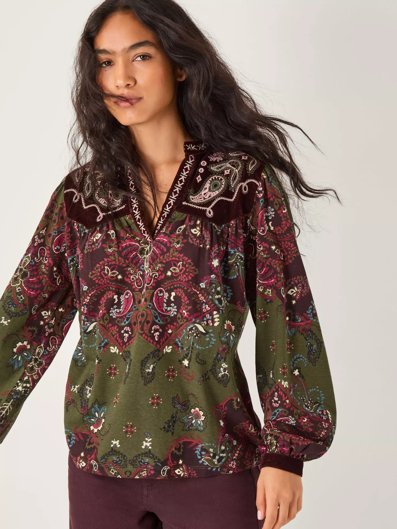 A jersey top from Monsoon, blended from linen. With a V-neck and long sleeves, it's patterned with pretty paisley florals. Casual, comfortable, and effortlessly chic.