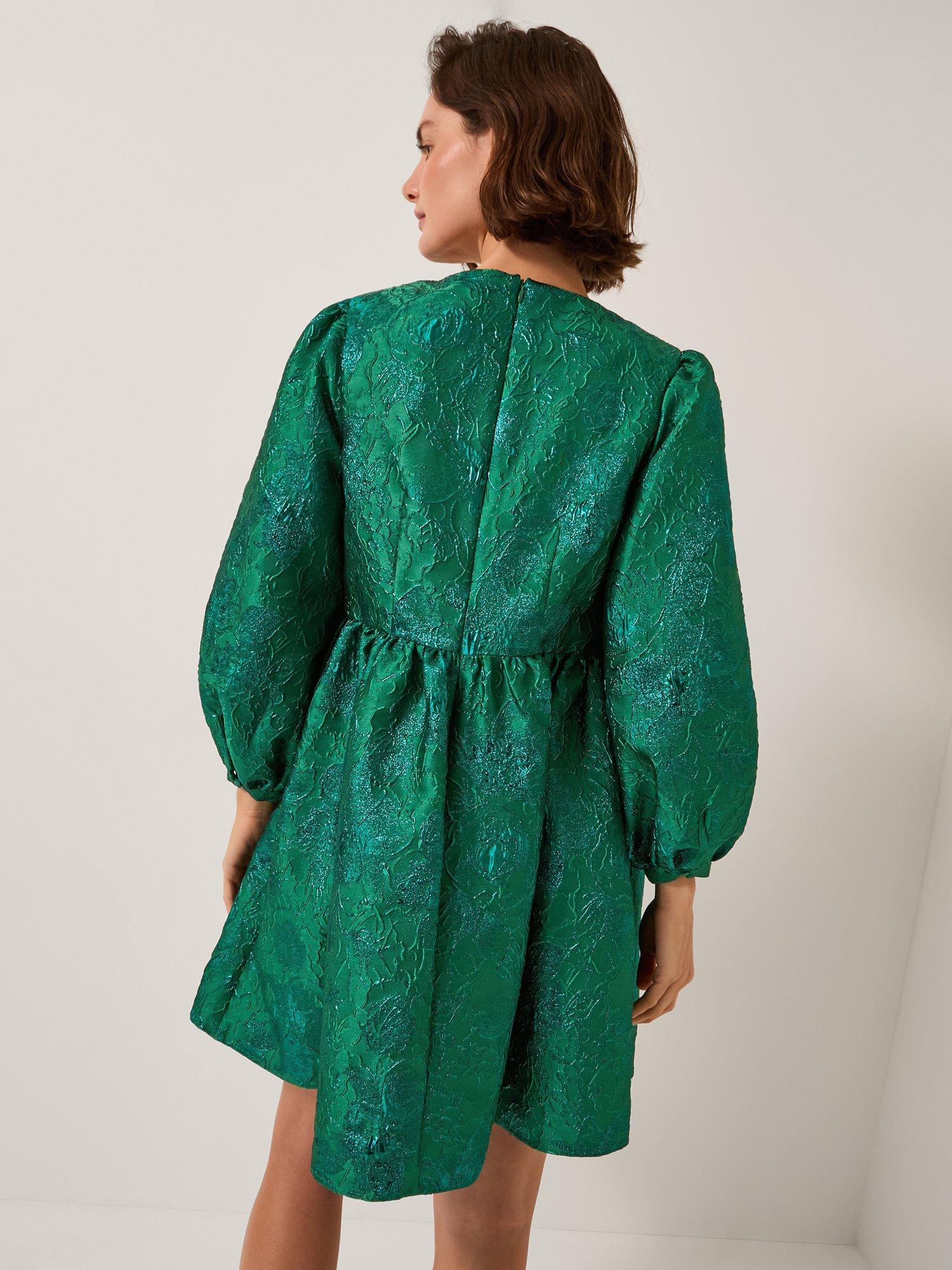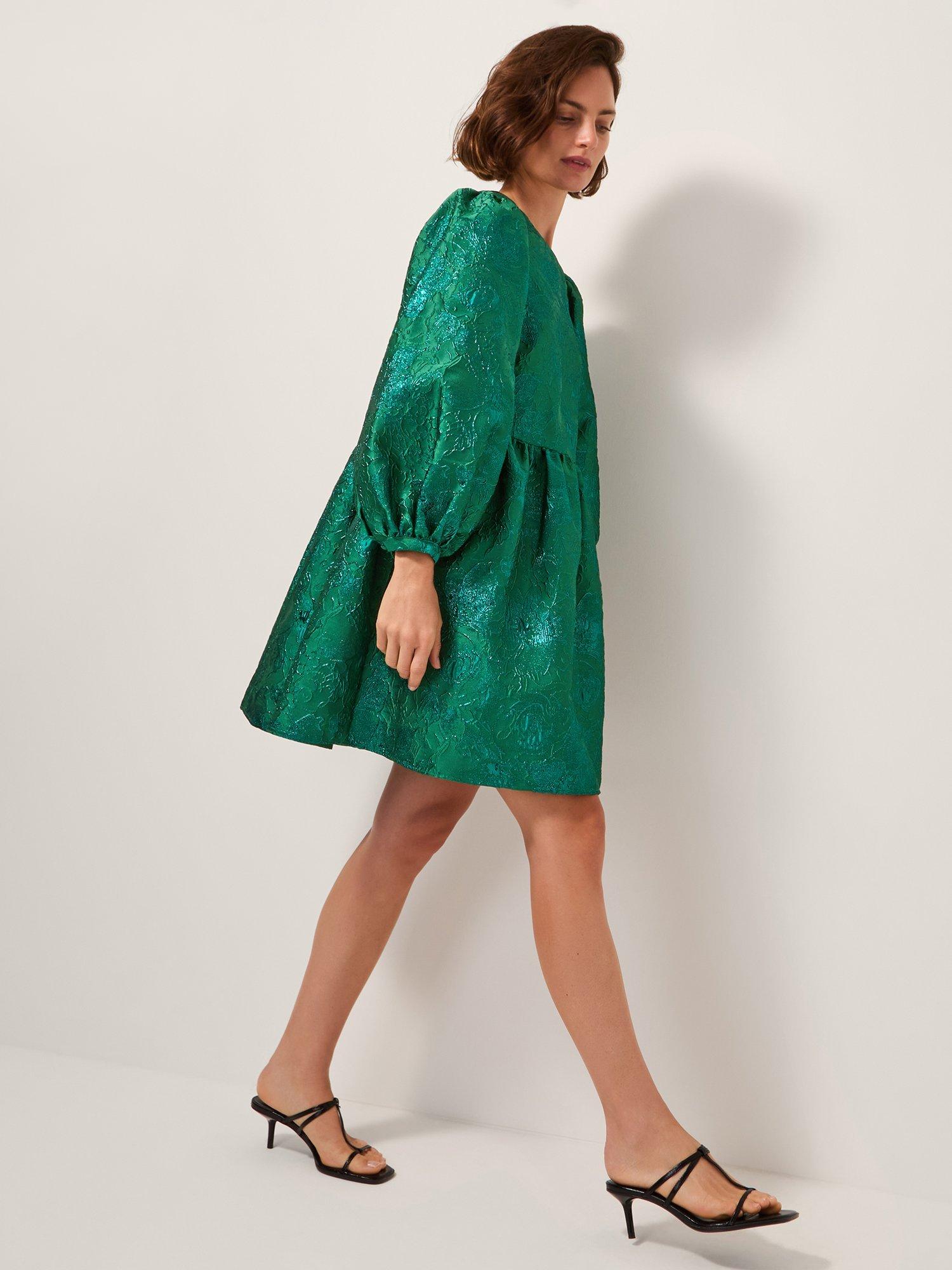 A mini smock dress, featuring shimmering florals, playful puff sleeves, and a comfy concealed zip for easy wear.