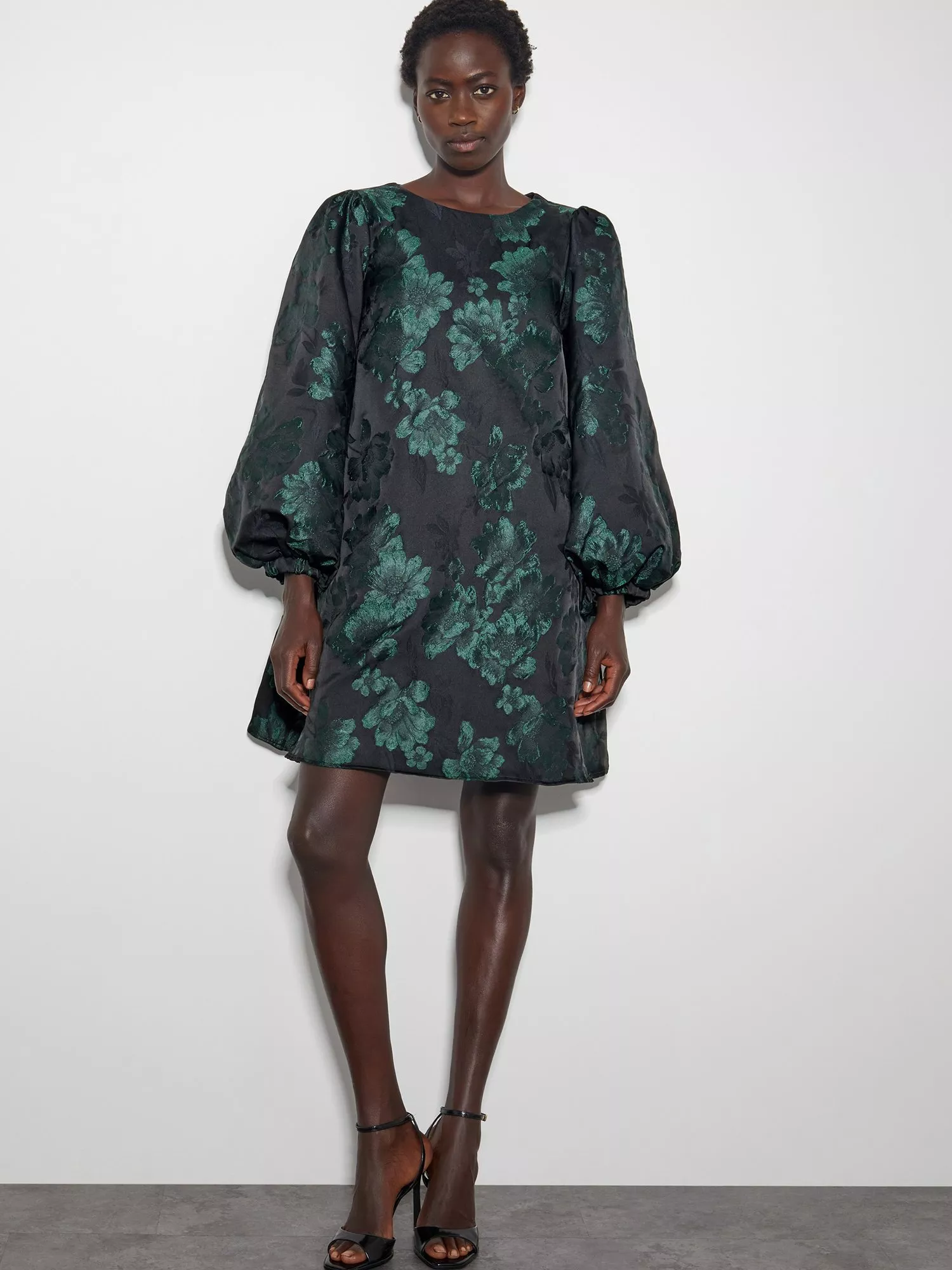 Cut to a shift shape with statement voluminous sleeves, this mini dress from Monsoon is fashioned with a pretty floral jacquard pattern for added charm.
