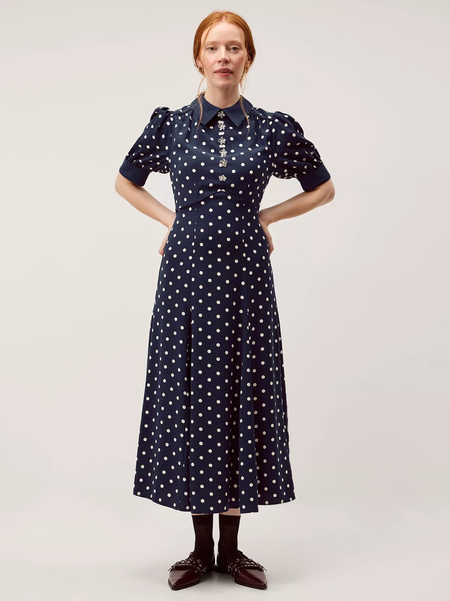Do it with flare. This elbow length midi dress by Monsoon features a collar neck and eye-catching polka dot print.