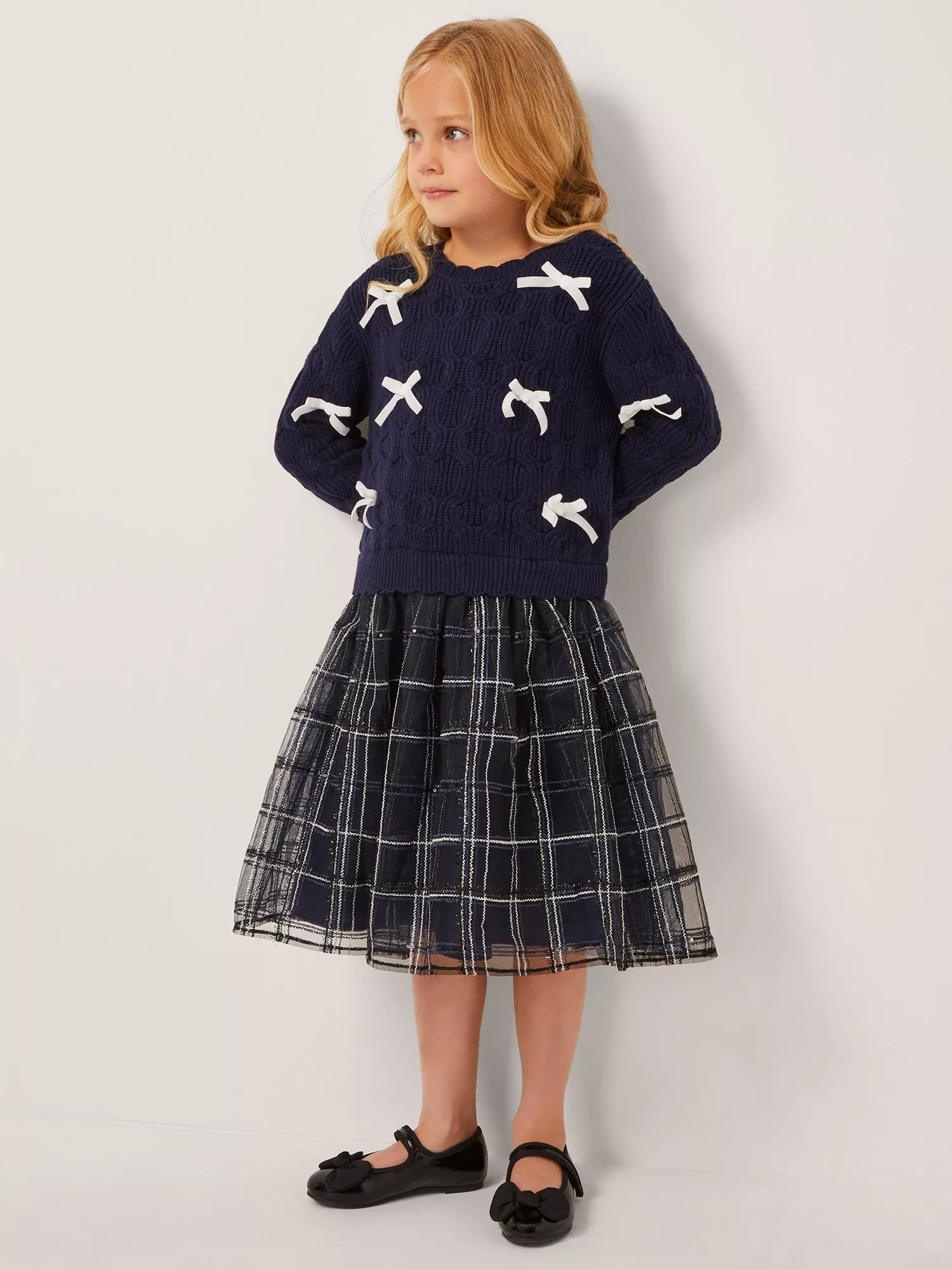 A playful pick for the mini fashionistas, this 2-in-1 dress features a navy jumper-inspired top adorned with white ribbon bows, whilst the puffy skirt boasts a bold checkered pattern over the mesh fabric. Complete the look with some trendy ballet flats.