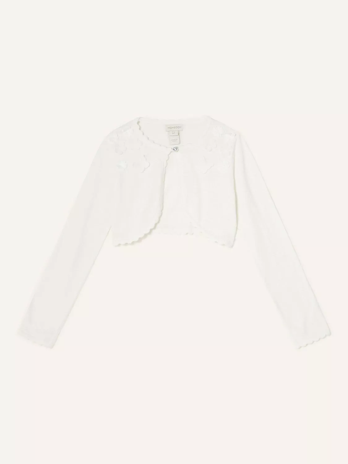 A light layer that will still show off their occasion dress, this cardigan is crafted with floral detailing and a sparkly button to the neckline. Look closely and you'll see the sweet scallop trims!