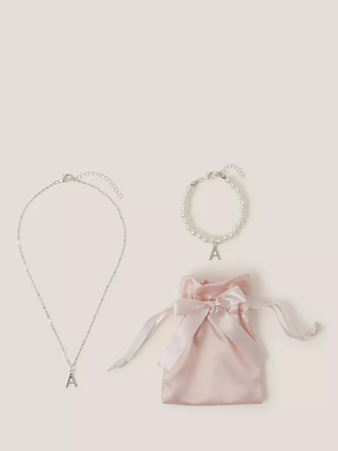 An 'A' initial necklace and bracelet, presented in a satin pouch.