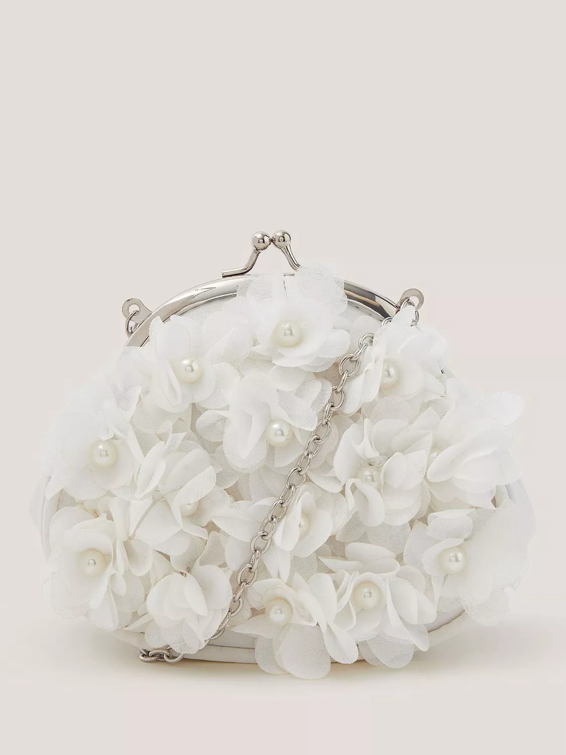 Decorated on one side with pearl trimmed flowers, this is a beautiful bag for bridesmaids, First Communions and other special occasions.