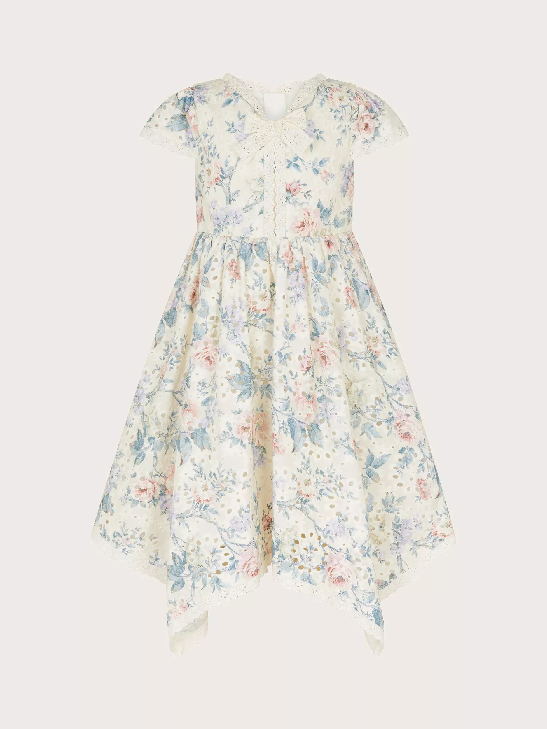 Get them the perfect dress, once and floral. Made from a broderie-embroidered fabric patterned with vintage florals, this pretty frock is great for any occasion. Designed with short sleeves and a swishy handkerchief hem.