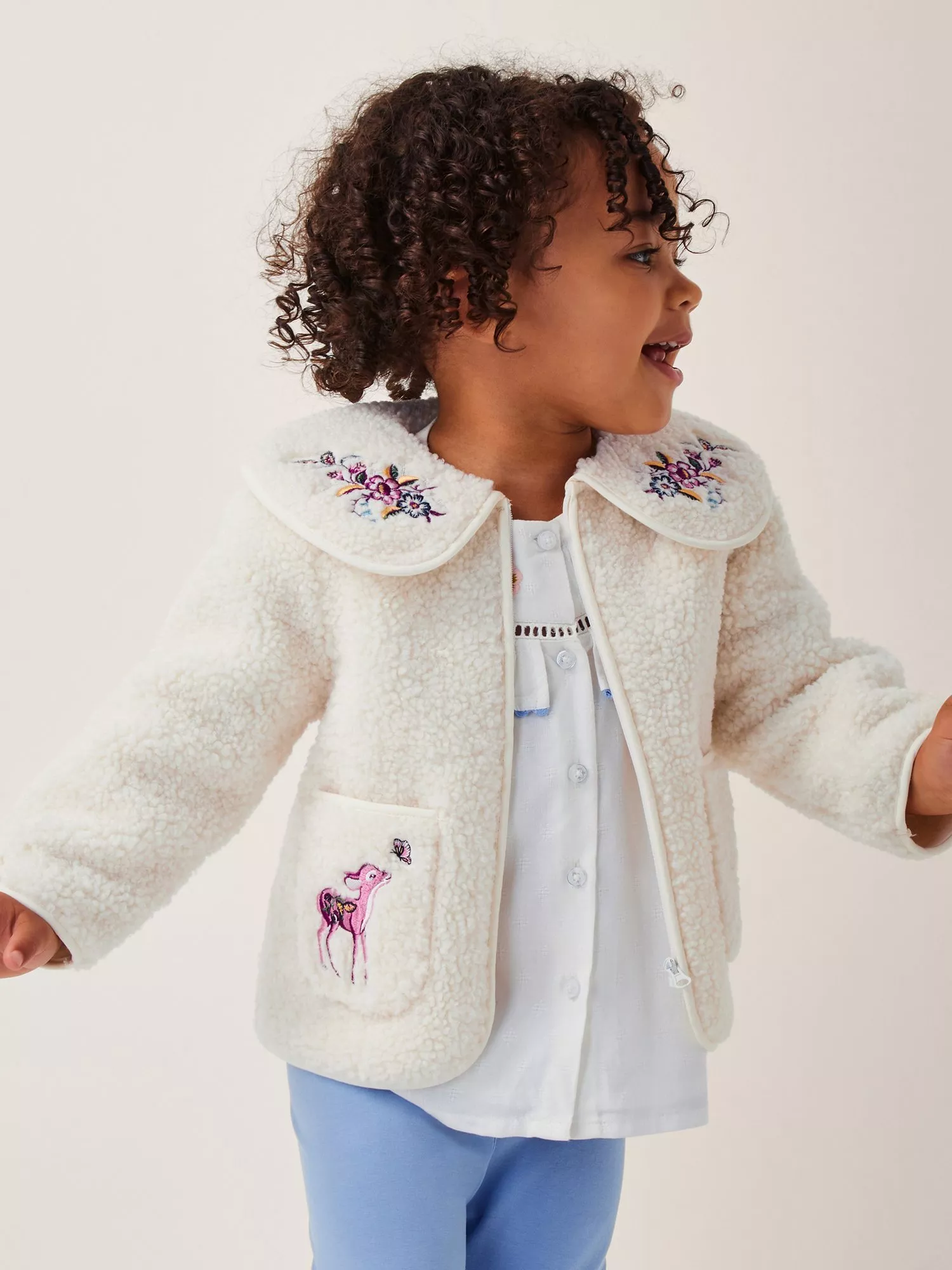 Keep them cute and cosy in this snuggly borg fleece. Finished with an easy-peasy zip fastening, it's embroidered with a cute fawn and colourful floral motifs on the collar and patch pockets.
